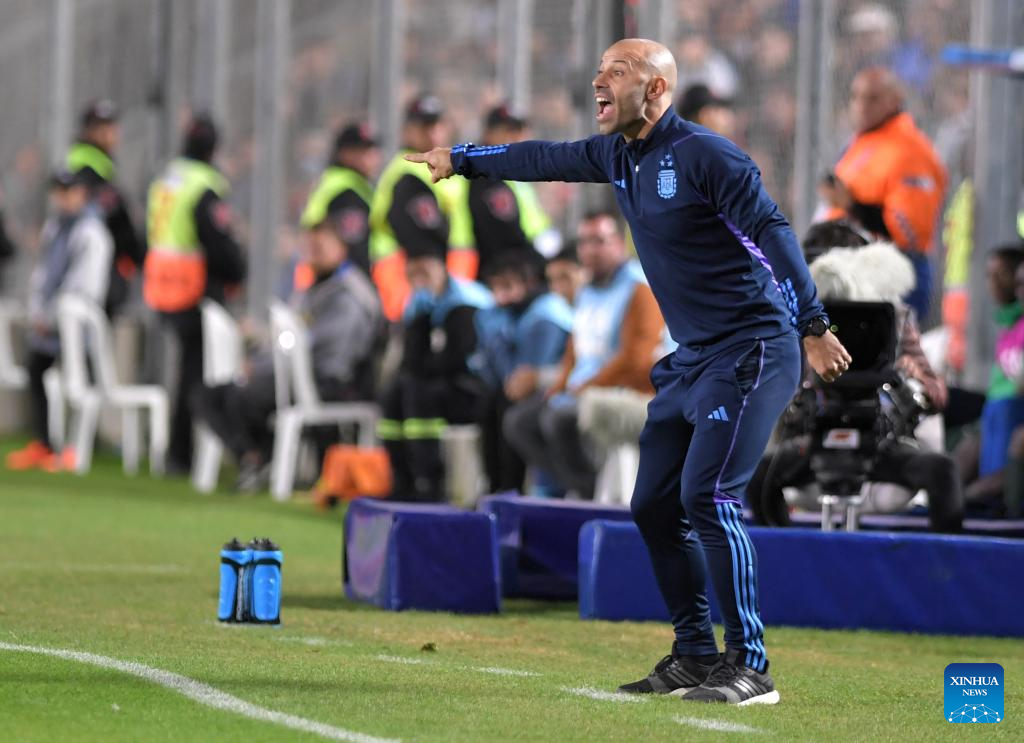 Head coach Javier Mascherano of Argentina gestures during the FIFA U20 World Cup Round of 16 match between Argentina and Nigeria in San Juan, Argentina, May 31, 2023. (TELAM/Handout via Xinhua)