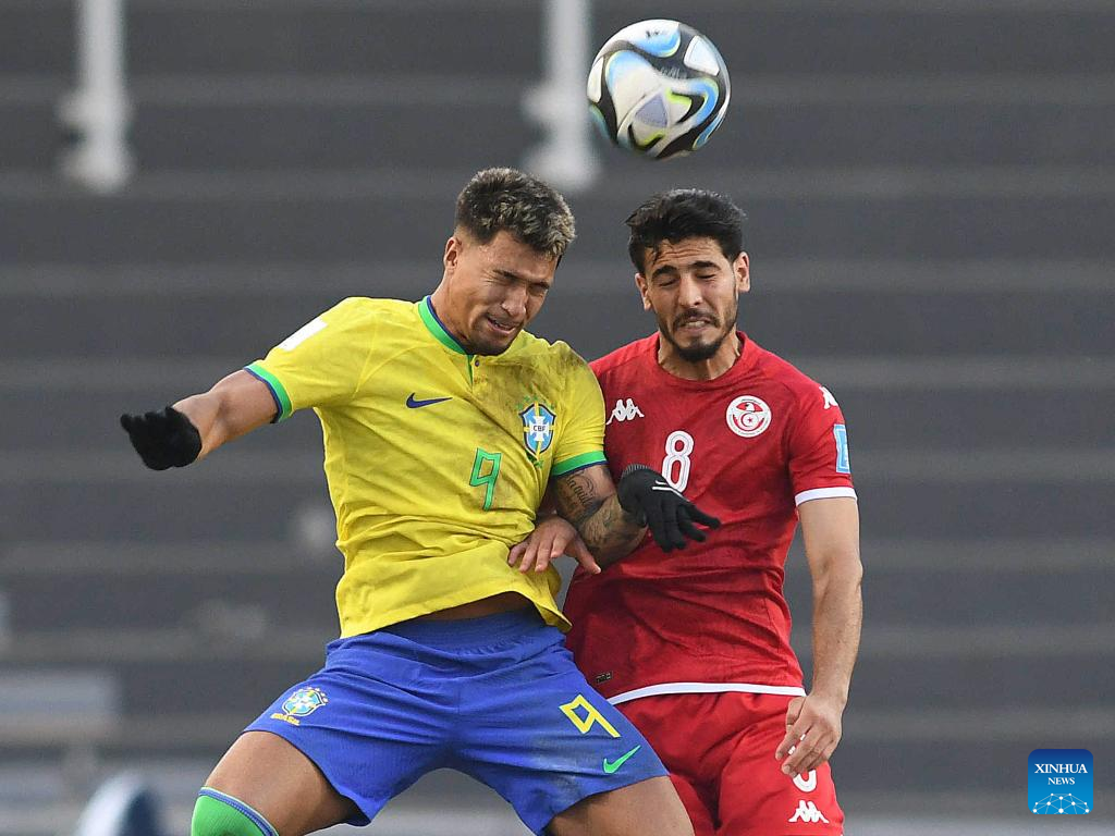 Marcos Leonardo (L) of Brazil vies with Yassine Dridi of Tunesia during the FIFA U20 World Cup round of 16 match between Brazil and Tunesia in La Plata, Argentina, May 31, 2023. (TELAM/Handout via Xinhua)