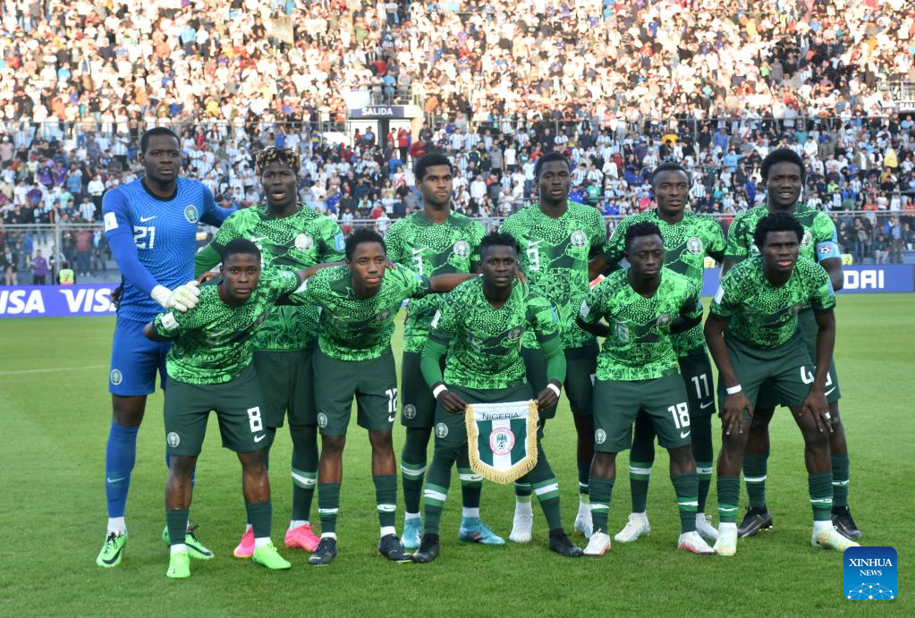 Nigeria's starters pose for a group photo before the FIFA U20 World Cup Round of 16 match between Argentina and Nigeria in San Juan, Argentina, May 31, 2023. (TELAM/Handout via Xinhua)