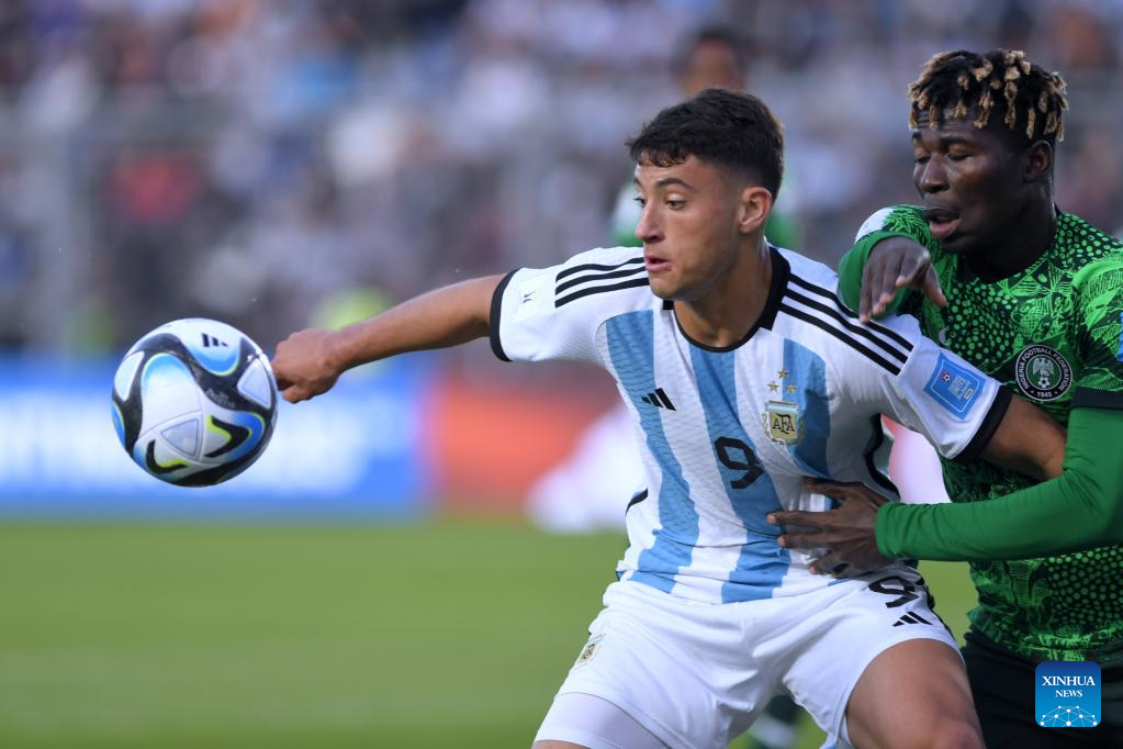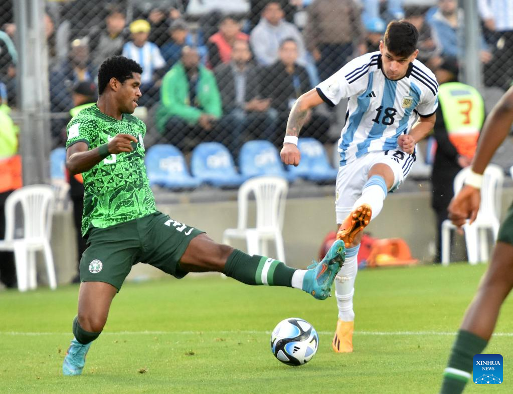 Alejo Veliz (L) of Argentina vies with Abel Ogwuche of Nigeria during the FIFA U20 World Cup Round of 16 match between Argentina and Nigeria in San Juan, Argentina, May 31, 2023. (TELAM/Handout via Xinhua)