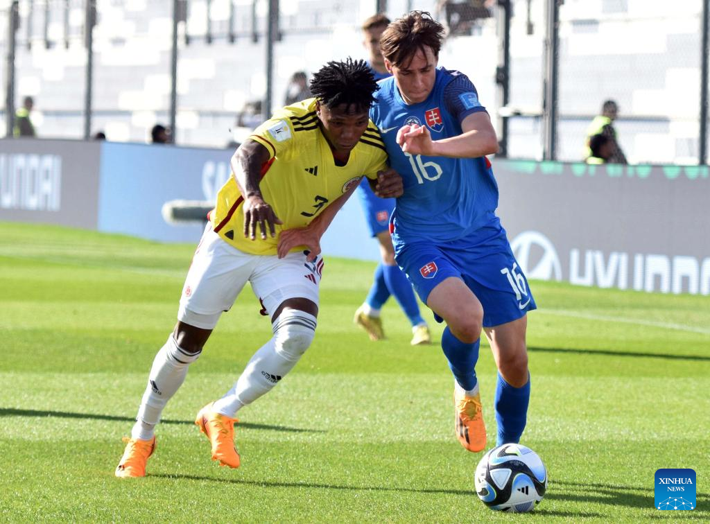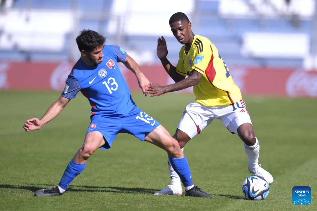 Edier Ocampo (L) of Colombia vies with Leo Sauer of Slovakia during the FIFA U20 World Cup Round of 16 match between Colombia and Slovakia in San Juan, Argentina, May 31, 2023. (TELAM/Handout via Xinhua)