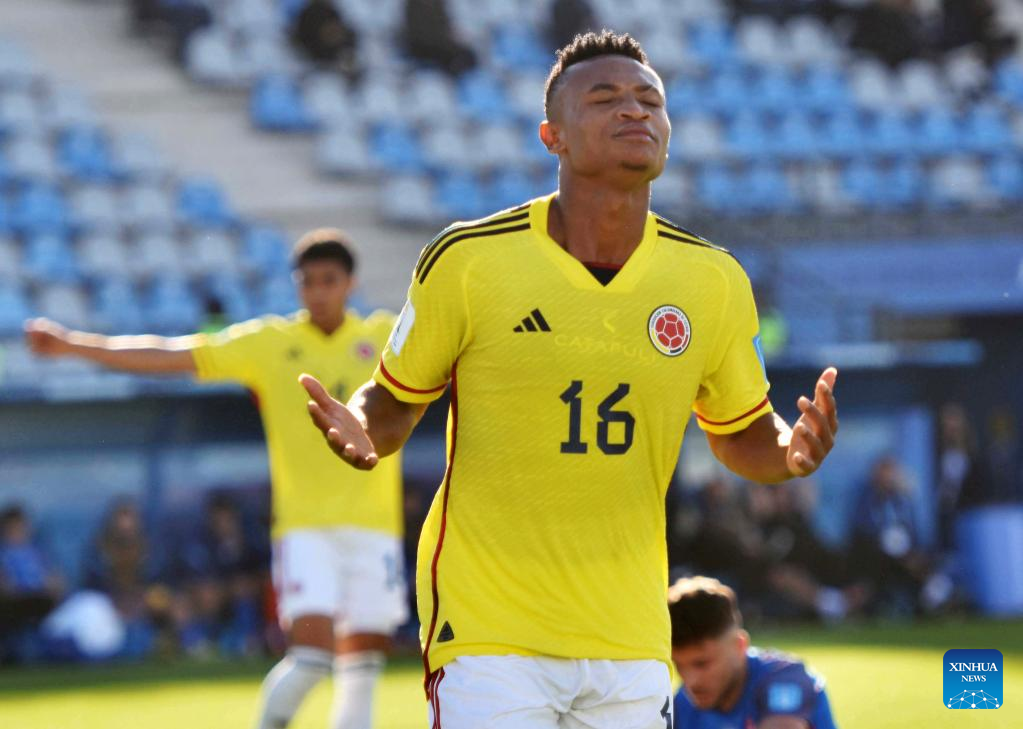 Oscar Cortes of Colombia celebrates his goal during during the FIFA U20 World Cup Round of 16 match between Colombia and Slovakia in San Juan, Argentina, May 31, 2023. (TELAM/Handout via Xinhua)