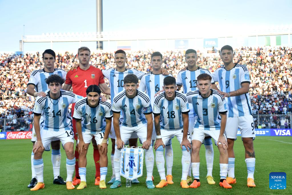 Argentina's starters pose for a group photo before the FIFA U20 World Cup Round of 16 match between Argentina and Nigeria in San Juan, Argentina, May 31, 2023. (TELAM/Handout via Xinhua)