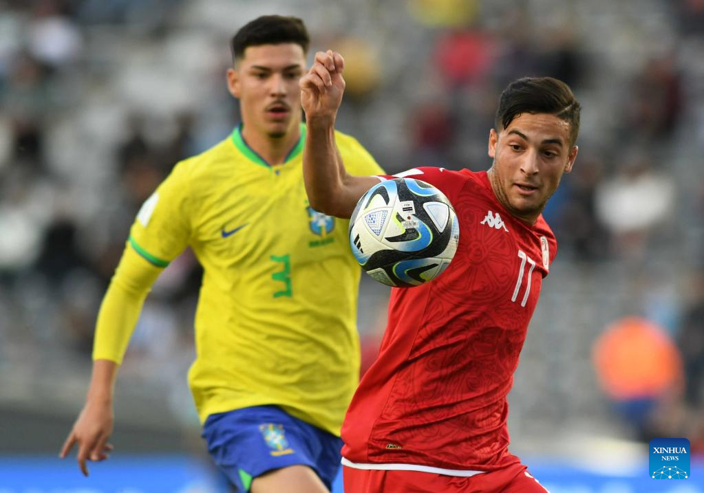 Raki Aouani (R) of Tunesia breaks throuth during the FIFA U20 World Cup round of 16 match between Brazil and Tunesia in La Plata, Argentina, May 31, 2023. (TELAM/Handout via Xinhua)
