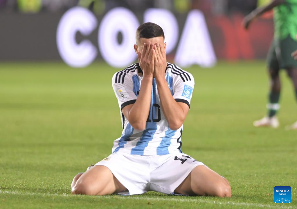 Valentin Carboni of Argentina looks dejected during the FIFA U20 World Cup Round of 16 match between Argentina and Nigeria in San Juan, Argentina, May 31, 2023. (TELAM/Handout via Xinhua)