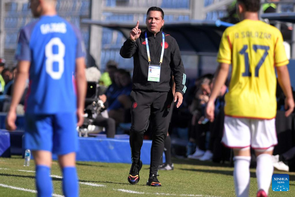 Head coach Hector Cardenas (C) of Colombia gestures during the FIFA U20 World Cup Round of 16 match between Colombia and Slovakia in San Juan, Argentina, May 31, 2023. (TELAM/Handout via Xinhua)