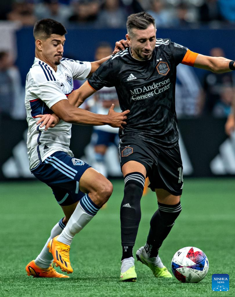 Vancouver Whitecaps' Mathias Laborda (L) vies with Houston Dynamo's Hector Herrera during the 2023 Major League Soccer (MLS) match between Vancouver Whitecaps and Houston Dynamo at BC Place in Vancouver, Canada, on May 31, 2023. (Photo by Andrew Soong/Xinhua)