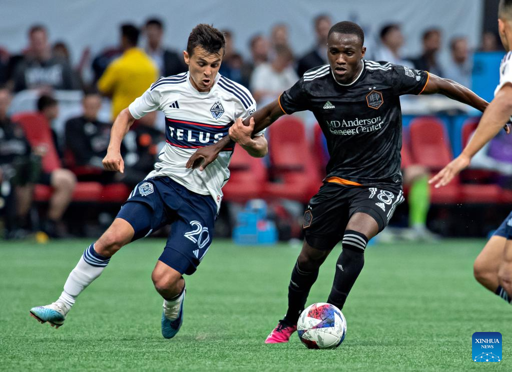 Vancouver Whitecaps' Brian White (R) vies with Houston Dynamo's Franco Escobar during the 2023 Major League Soccer (MLS) match between Vancouver Whitecaps and Houston Dynamo at BC Place in Vancouver, Canada, on May 31, 2023. (Photo by Andrew Soong/Xinhua)