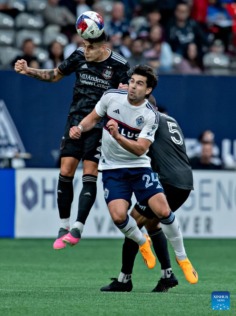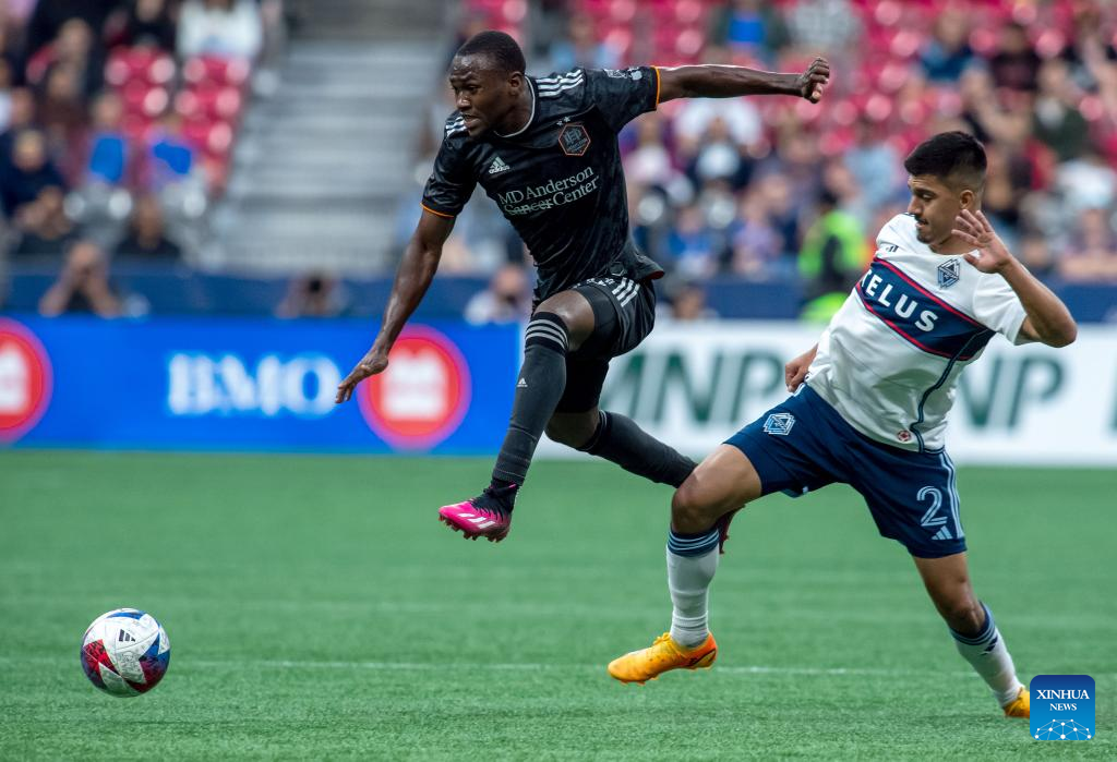 Houston Dynamo's Ibrahim Aliyu (L) heads the ball during the 2023 Major League Soccer (MLS) match between Vancouver Whitecaps and Houston Dynamo at BC Place in Vancouver, Canada, on May 31, 2023. (Photo by Andrew Soong/Xinhua)