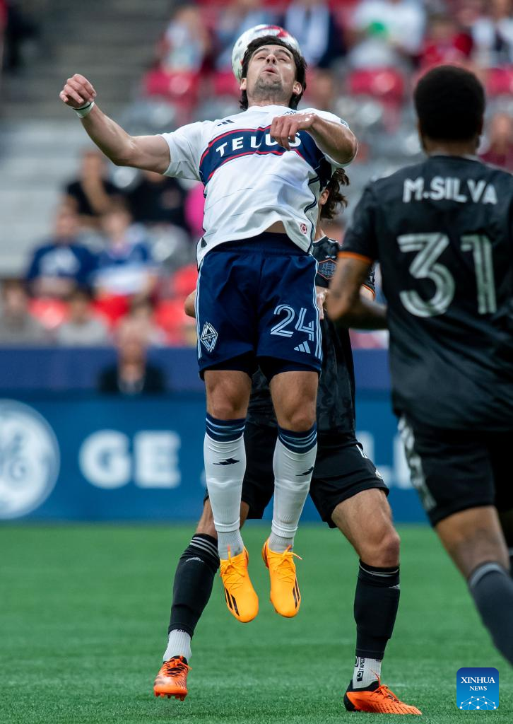 Vancouver Whitecaps' Brian White (L) heads for the ball during the 2023 Major League Soccer (MLS) match between Vancouver Whitecaps and Houston Dynamo at BC Place in Vancouver, Canada, on May 31, 2023. (Photo by Andrew Soong/Xinhua)