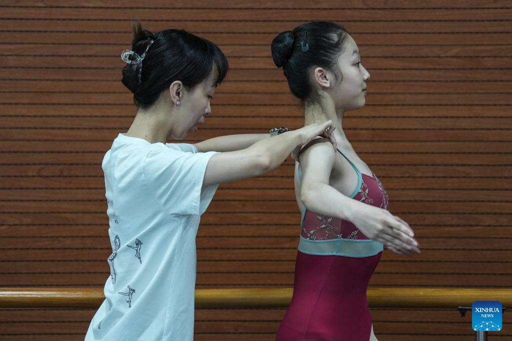A teacher corrects the posture of a student at a ballet school affiliated to Liaoning Ballet in Shenyang, northeast China's Liaoning Province, May 30, 2023. Founded in 1994, the ballet school affiliated to Liaoning Ballet is a major professional ballet training base in China.