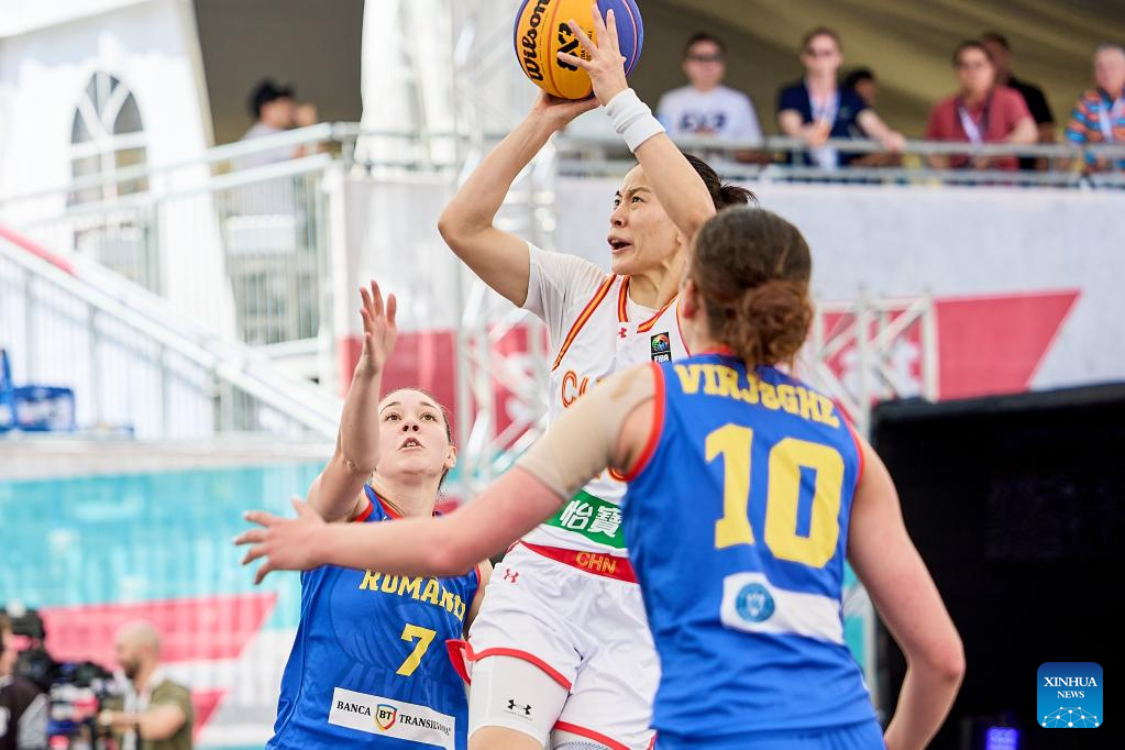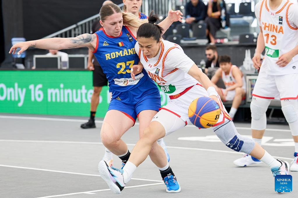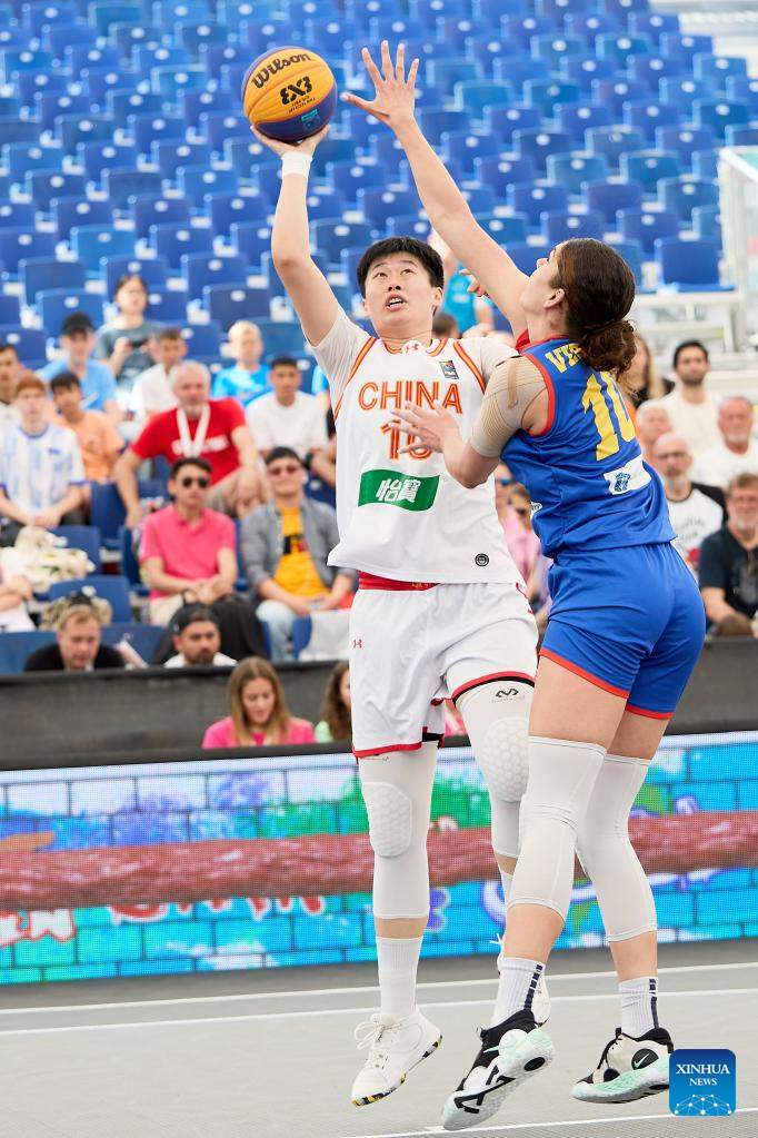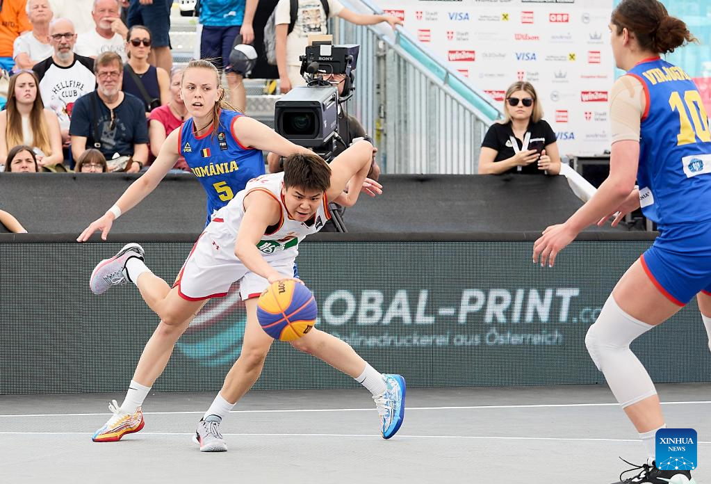 China's Zhang Yi (C) vies for the ball during the FIBA 3X3 World Cup women's pool D match between China and Romania in Vienna, Austria, June 2, 2023. (Photo by Georges Schneider/Xinhua)