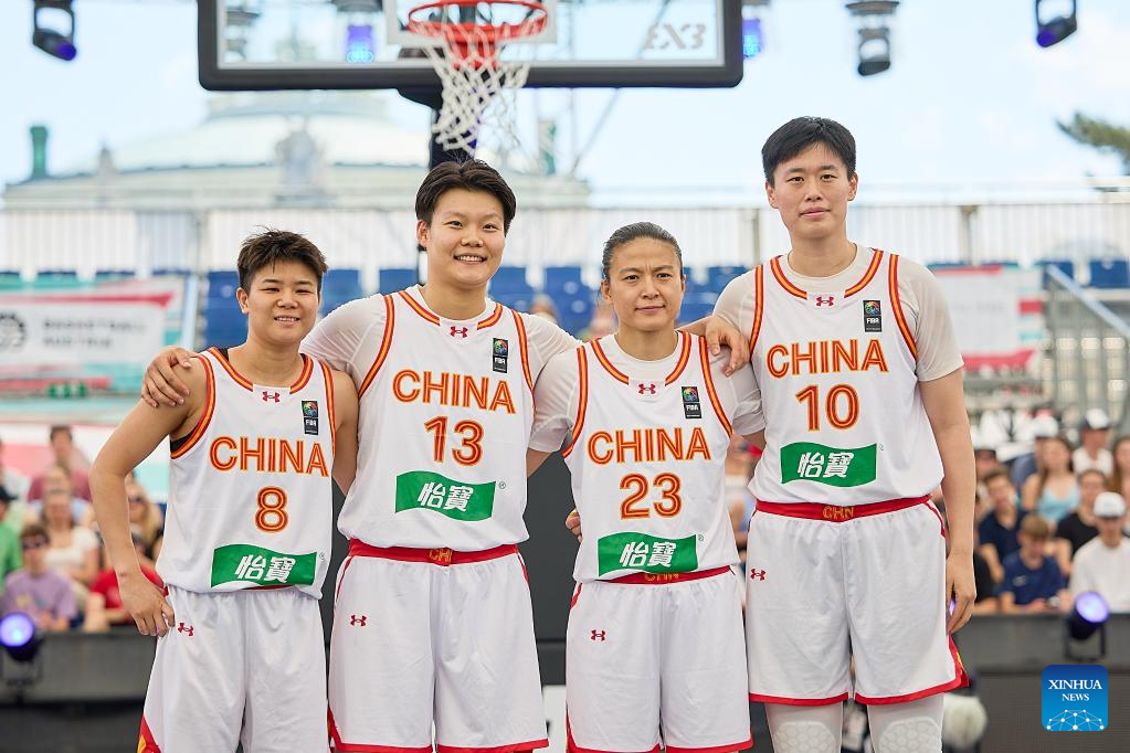 China's Zhang Yi, Wan Jiyuan, Wang Lili, Zhang Zhiting (L to R) pose for photos before the FIBA 3X3 World Cup women's pool D match between China and Romania in Vienna, Austria, June 2, 2023. (Photo by Georges Schneider/Xinhua)