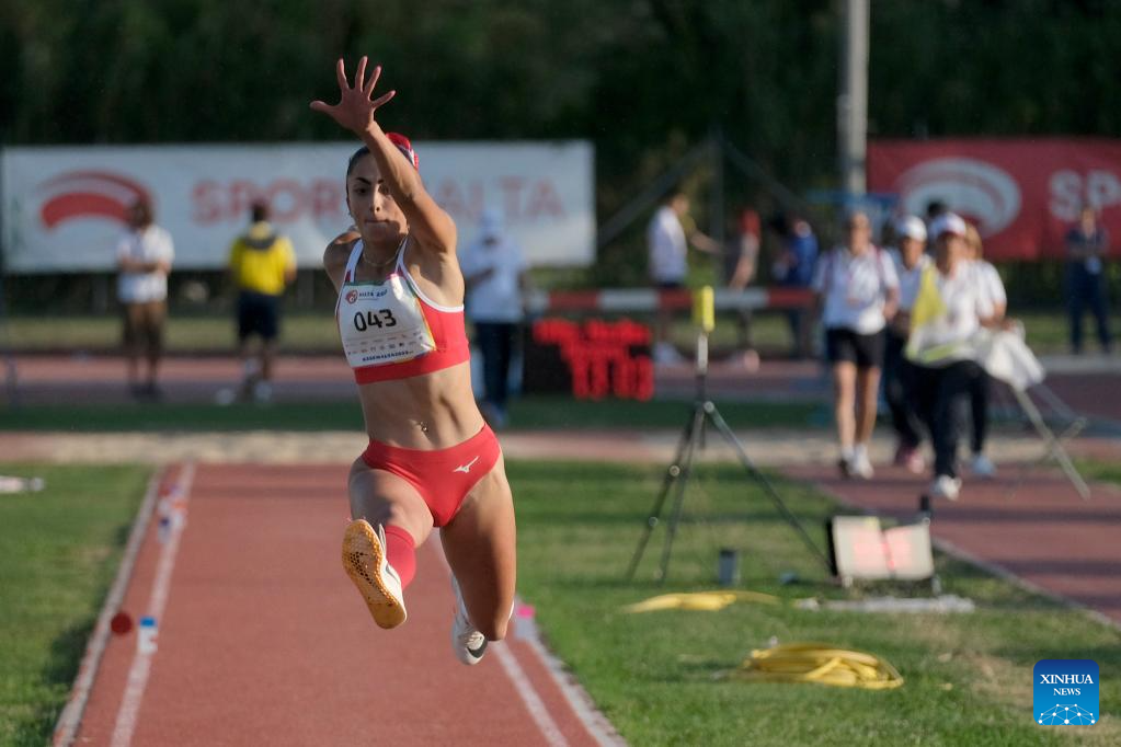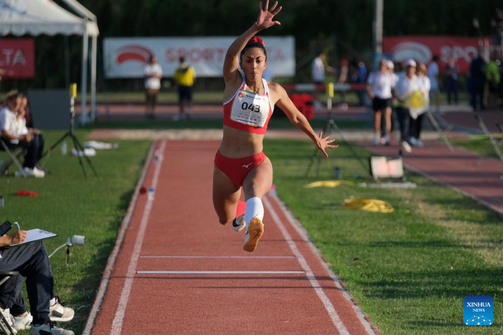 Maltese athlete Claire Azzopardi competes in the women's triple jump event at the 19th edition of the Games of the Small States of Europe, in Marsa, Malta, on June 1, 2023. (Photo by Jonathan Borg/Xinhua)