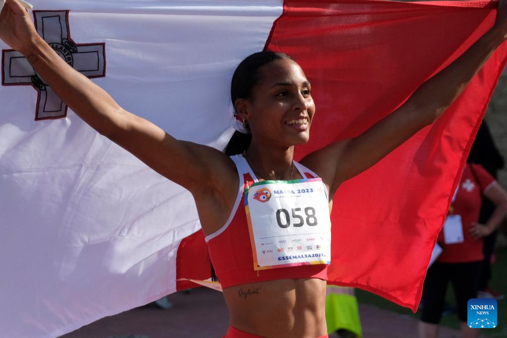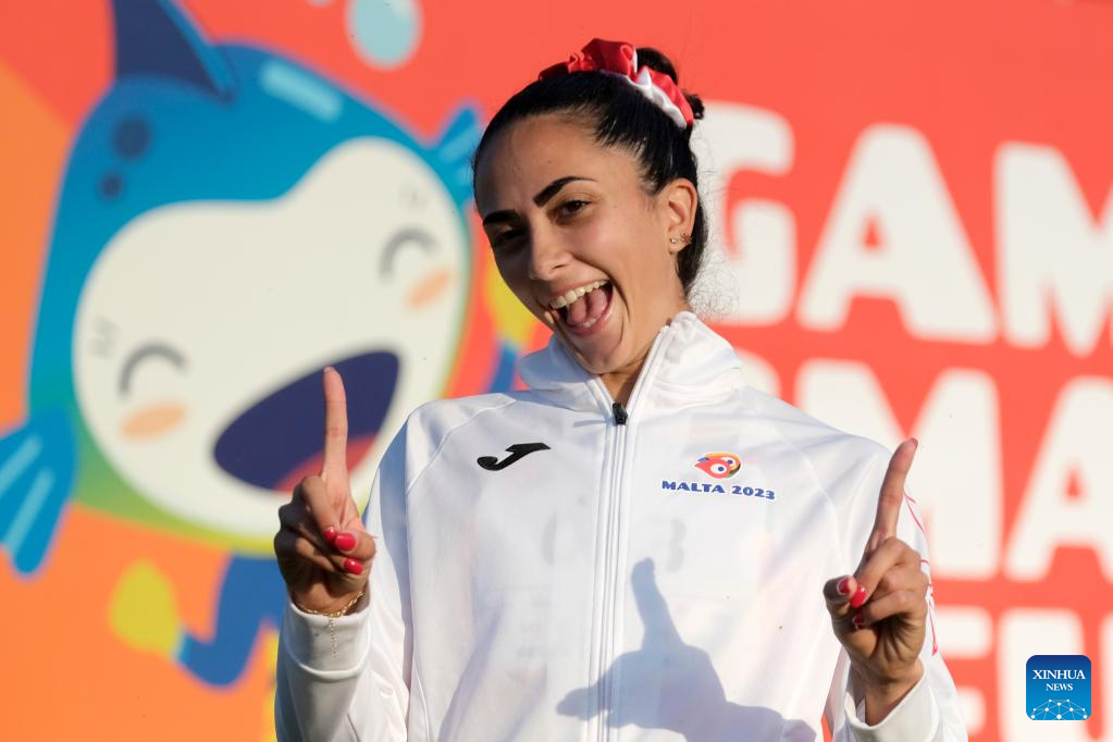 Maltese athlete Claire Azzopardi poses after winning the gold medal in the women's triple jump event at the 19th edition of the Games of the Small States of Europe, in Marsa, Malta, on June 1, 2023. (Photo by Jonathan Borg/Xinhua)