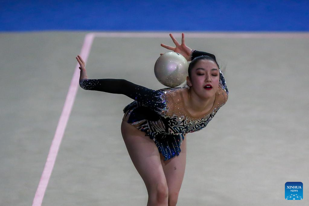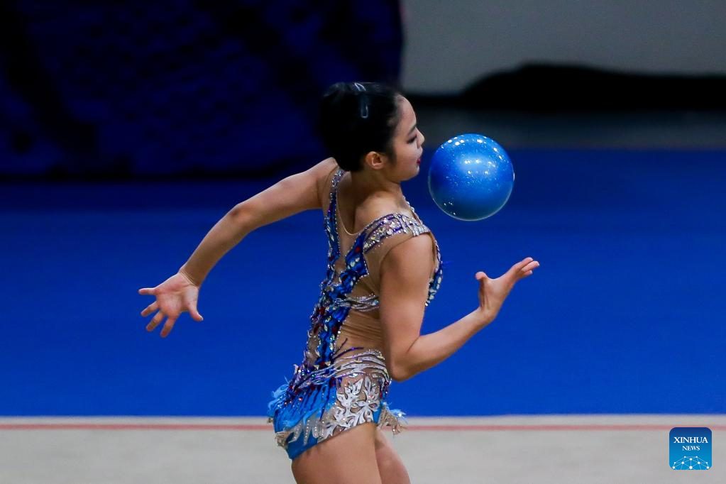 Wang Zilu of China competes in the ball event of senior's all-around final at the 14th Senior and 19th Junior Rhythmic Gymnastics Asian Championships in Manila, the Philippines on June 2, 2023. (Xinhua/Rouelle Umali)