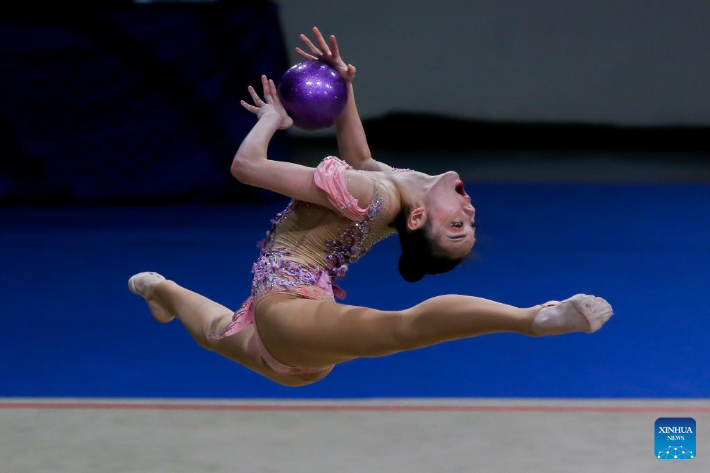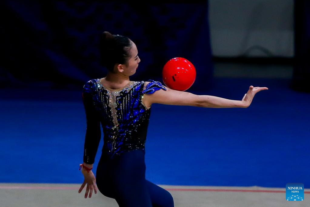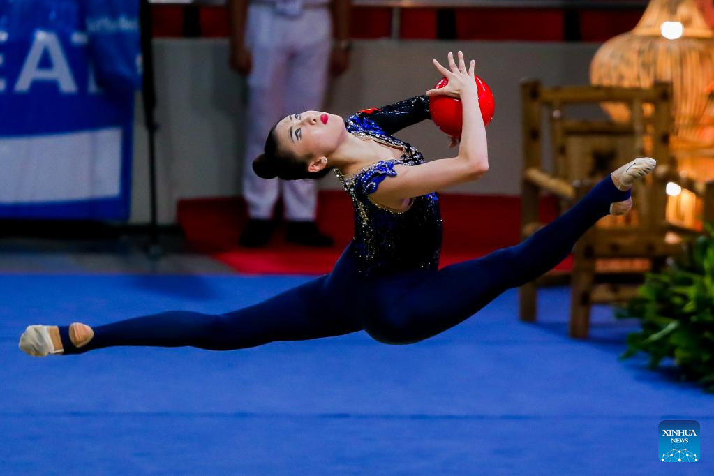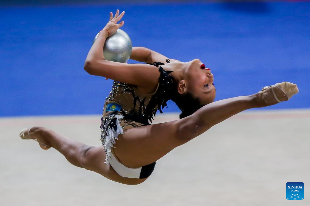Aibota Yertaikyzy of Kazakhstan competes in the ball event of senior's all-around final at the 14th Senior and 19th Junior Rhythmic Gymnastics Asian Championships in Manila, the Philippines on June 2, 2023. (Xinhua/Rouelle Umali)