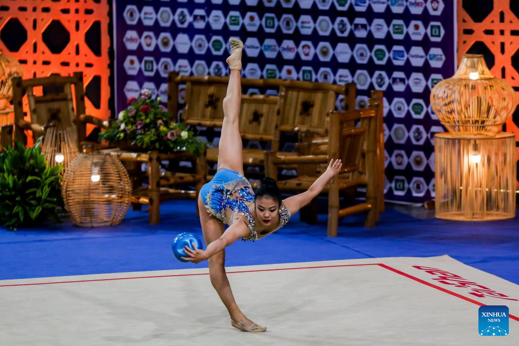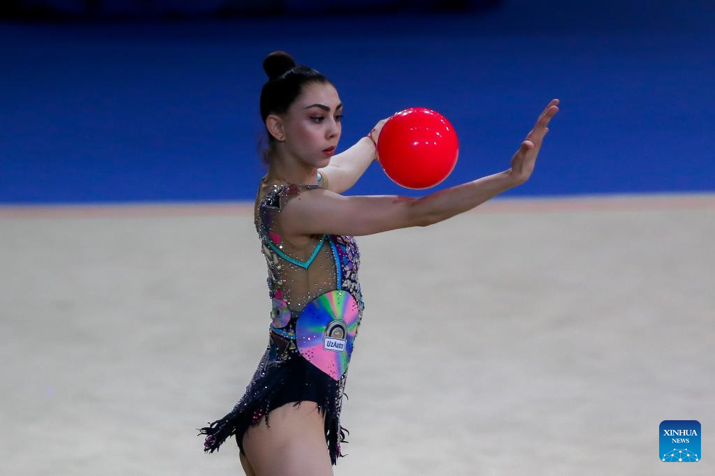 Takhmina Ikromova of Uzbekistan competes in the ball event of senior's all-around final at the 14th Senior and 19th Junior Rhythmic Gymnastics Asian Championships in Manila, the Philippines on June 2, 2023. (Xinhua/Rouelle Umali)