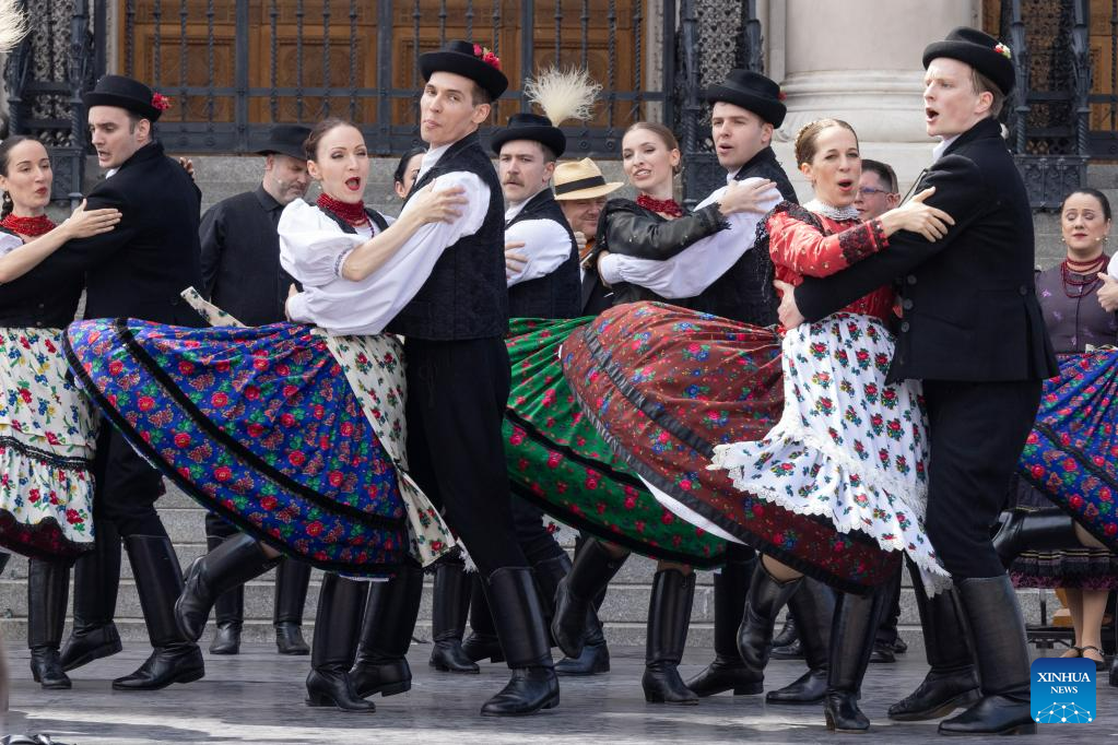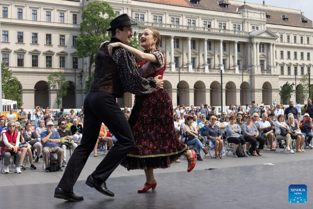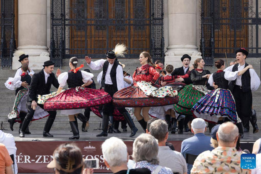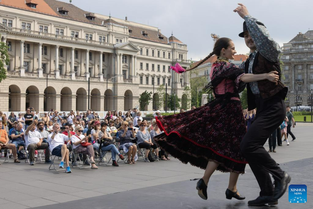 Folk dancers perform to celebrate the Day of National Unity in Budapest, Hungary, on June 2, 2023. (Photo by Attila Volgyi/Xinhua)