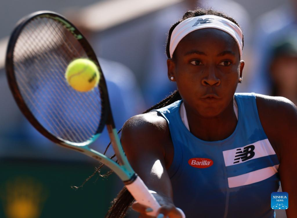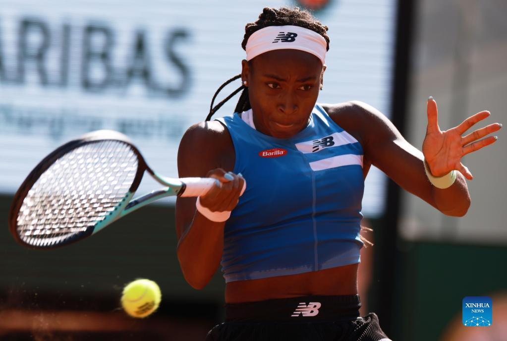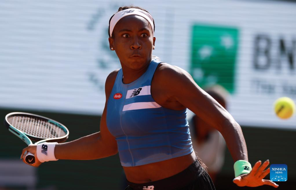 Coco Gauff of the United States competes during the women's singles fourth round match between Coco Gauff of the United States and Anna Karolina Schmiedlova of Slovakia at the French Open tennis tournament at Roland Garros in Paris, France, on June 5, 2023. (Xinhua/Gao Jing)