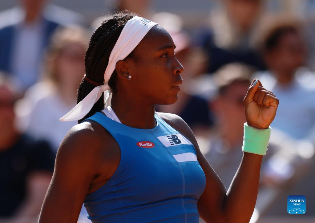 Coco Gauff of the United States reacts during the women's singles fourth round match between Coco Gauff of the United States and Anna Karolina Schmiedlova of Slovakia at the French Open tennis tournament at Roland Garros in Paris, France, on June 5, 2023. (Xinhua/Gao Jing)