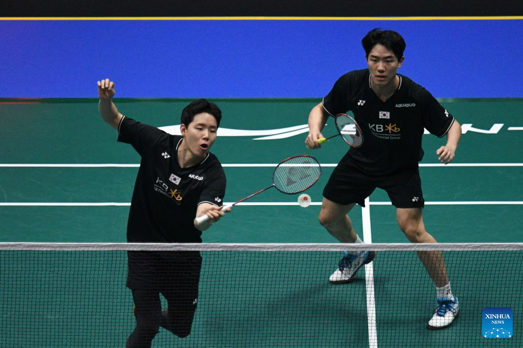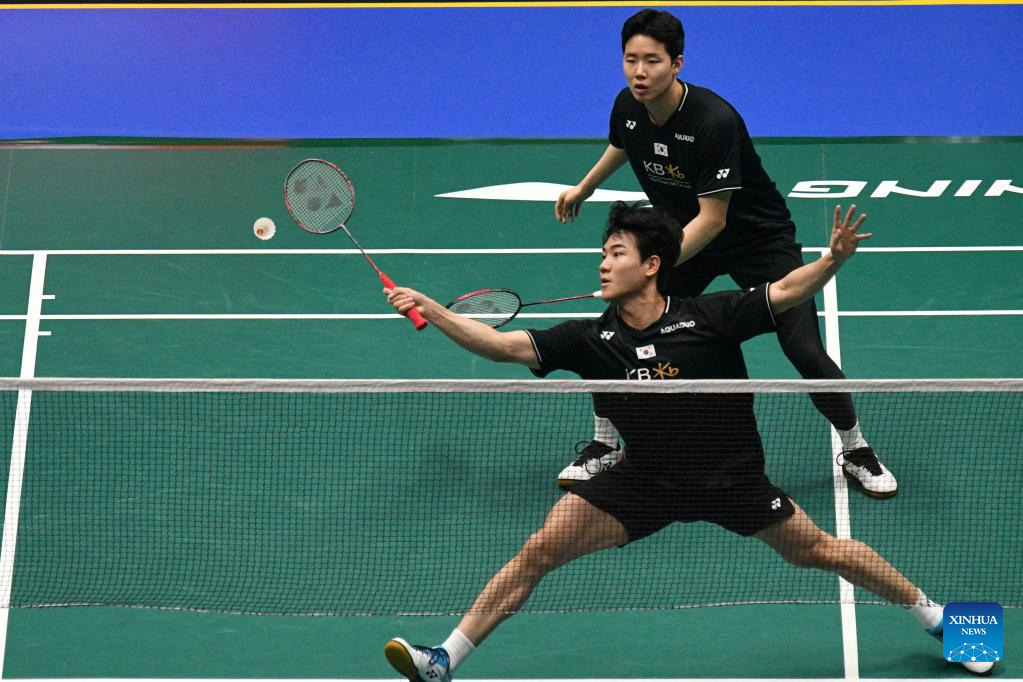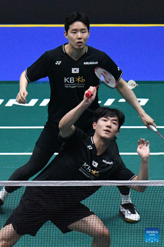 Kang Min Hyuk (front)/Seo Seung Jae compete during the men's doubles first round match between Hoki Takuro/Kobayashi Yugo of Japan and Kang Min Hyuk/Seo Seung Jae of South Korea at the Singapore Open badminton tournament in Singapore, on June 7, 2023. (Photo by Then Chih Wey/Xinhua)