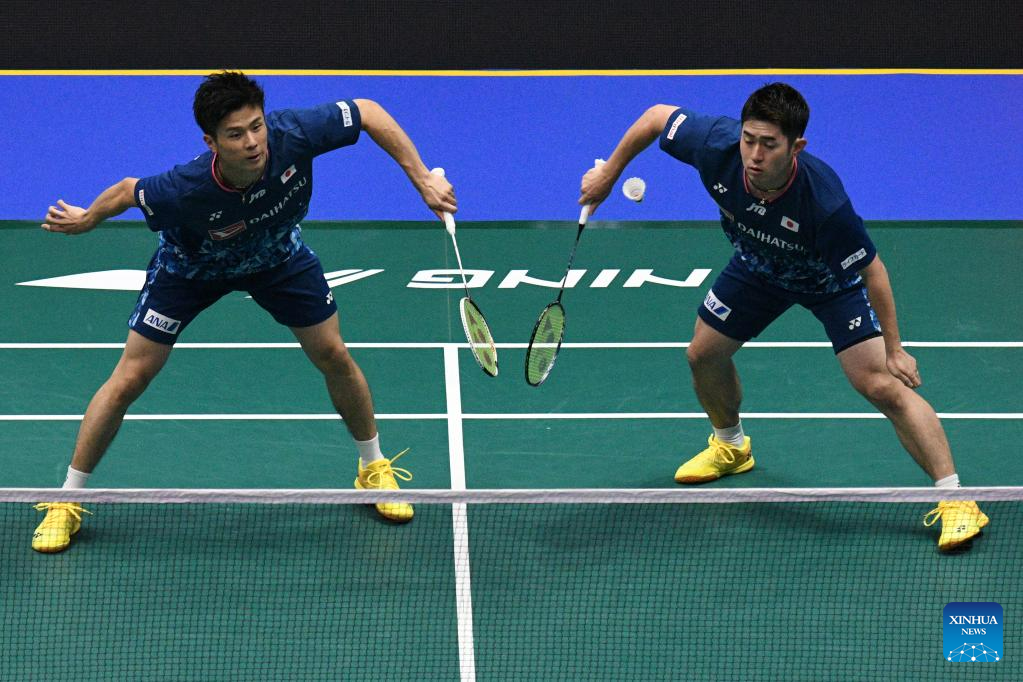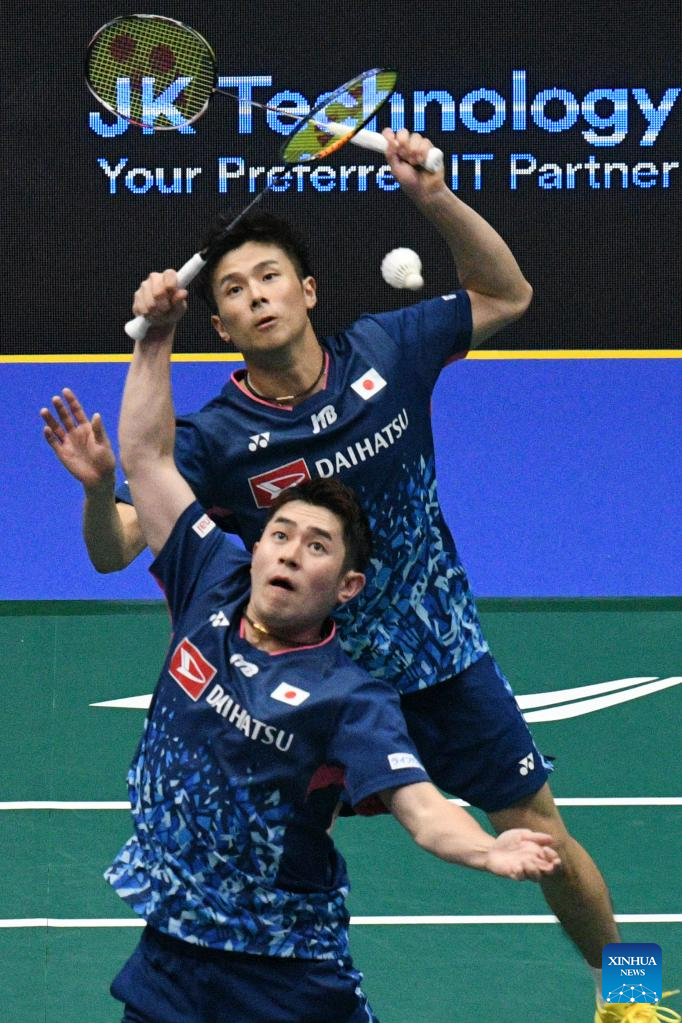 Hoki Takuro (R)/Kobayashi Yugo compete during the men's doubles first round match between Hoki Takuro/Kobayashi Yugo of Japan and Kang Min Hyuk/Seo Seung Jae of South Korea at the Singapore Open badminton tournament in Singapore, on June 7, 2023. (Photo by Then Chih Wey/Xinhua)