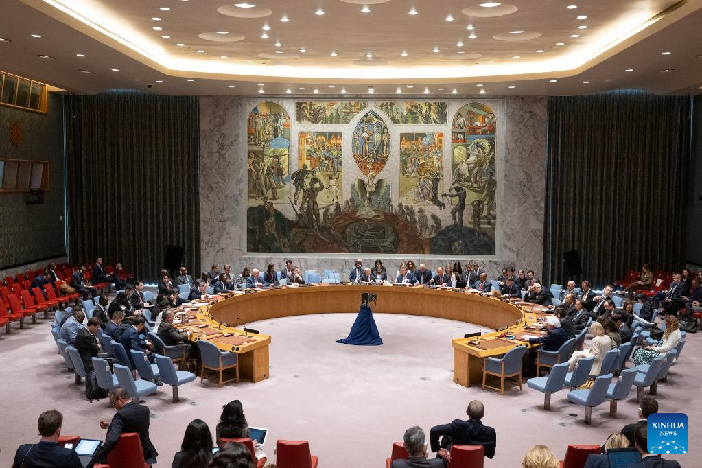 The UN Security Council holds an emergency meeting on the situation in Ukraine at the UN headquarters in New York, on June 6, 2023. UN Undersecretary-General for Humanitarian Affairs and Emergency Relief Coordinator Martin Griffiths on Tuesday warned of the grave consequences of the destruction of the Kakhovka hydroelectric power plant dam in southern Ukraine. (Eskinder Debebe/UN Photo/Handout via Xinhua)