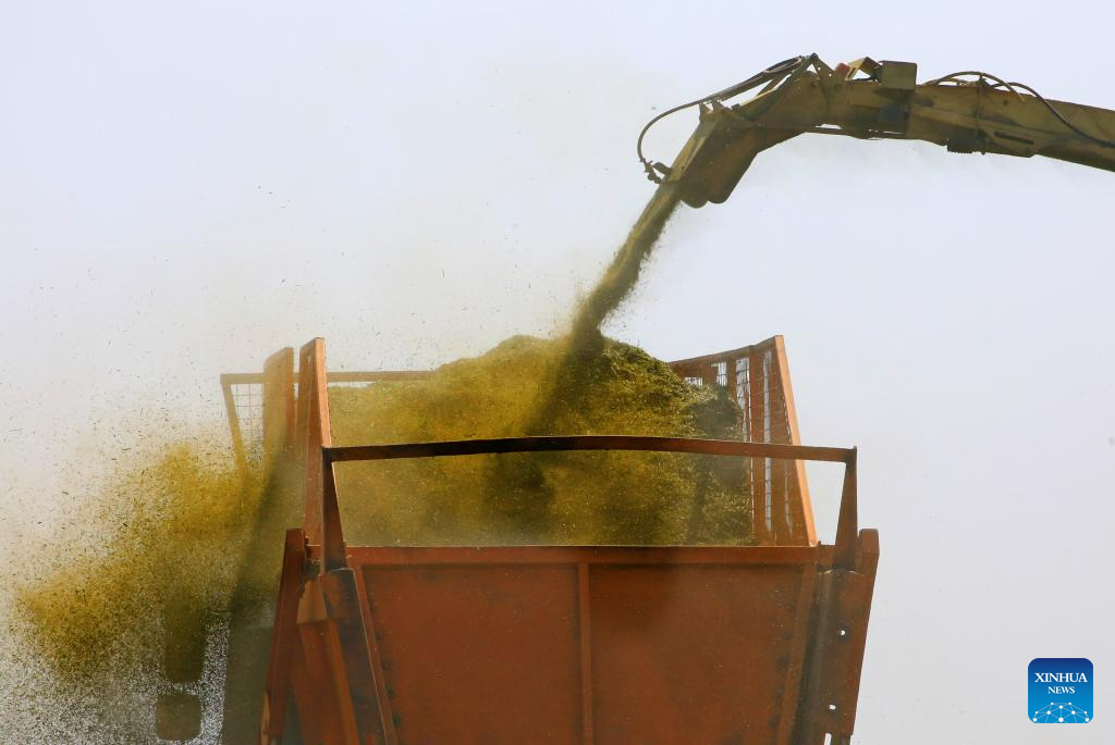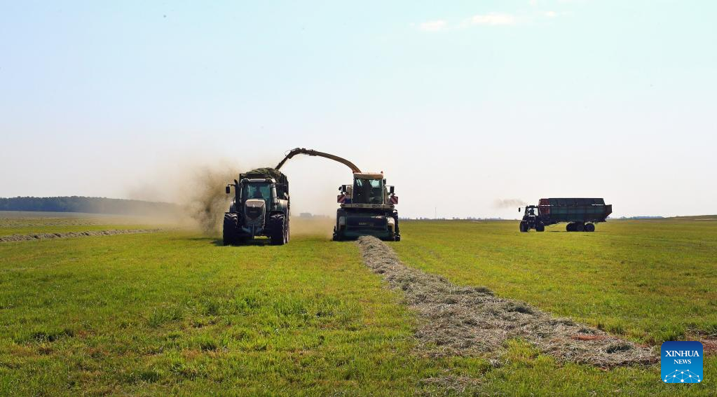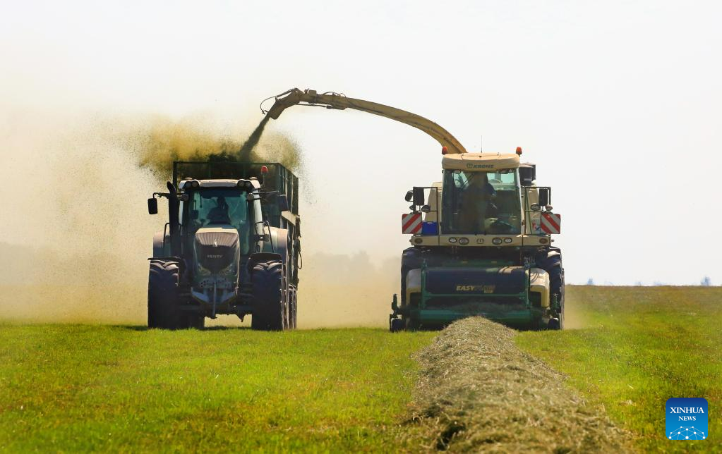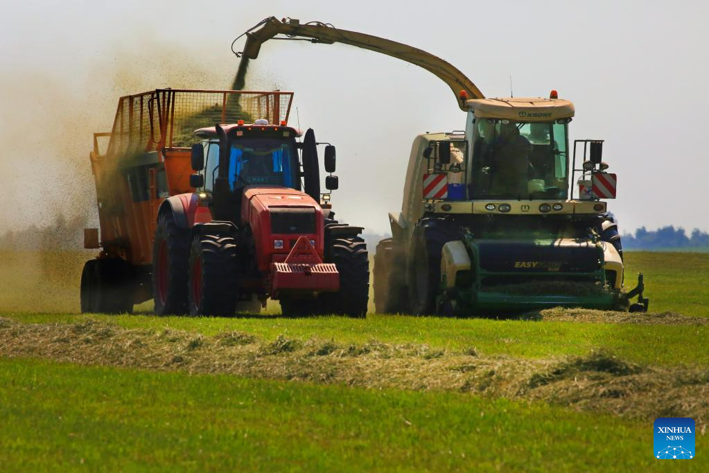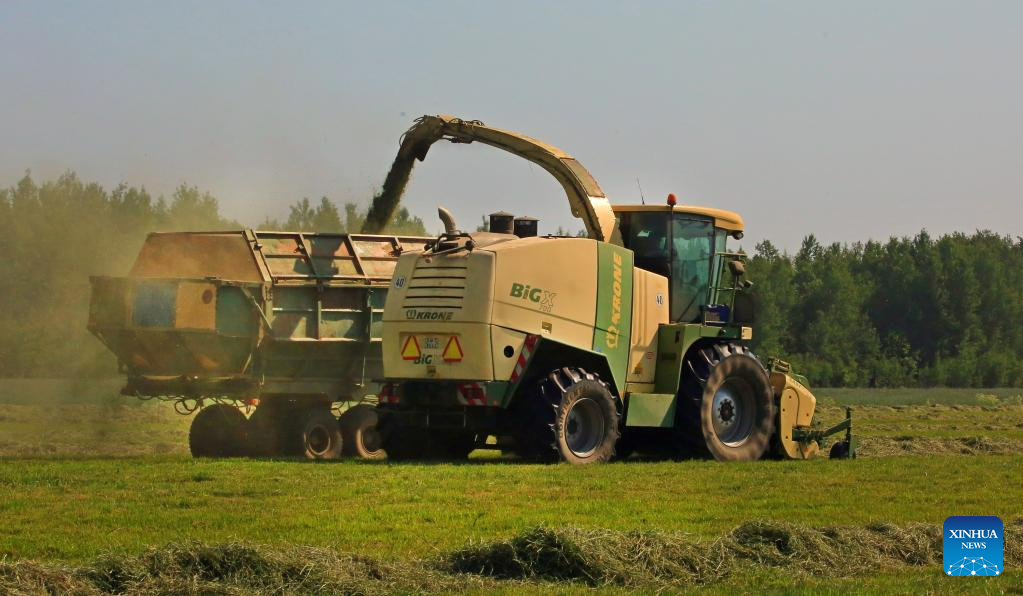 Hay is being harvested via agricultural machinery in Minsk, Belarus, June 9, 2023. (Photo by Henadz Zhinkov/Xinhua)