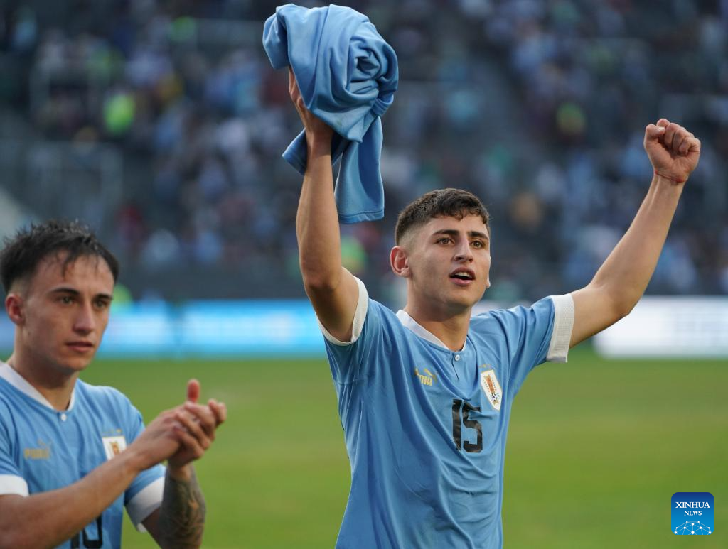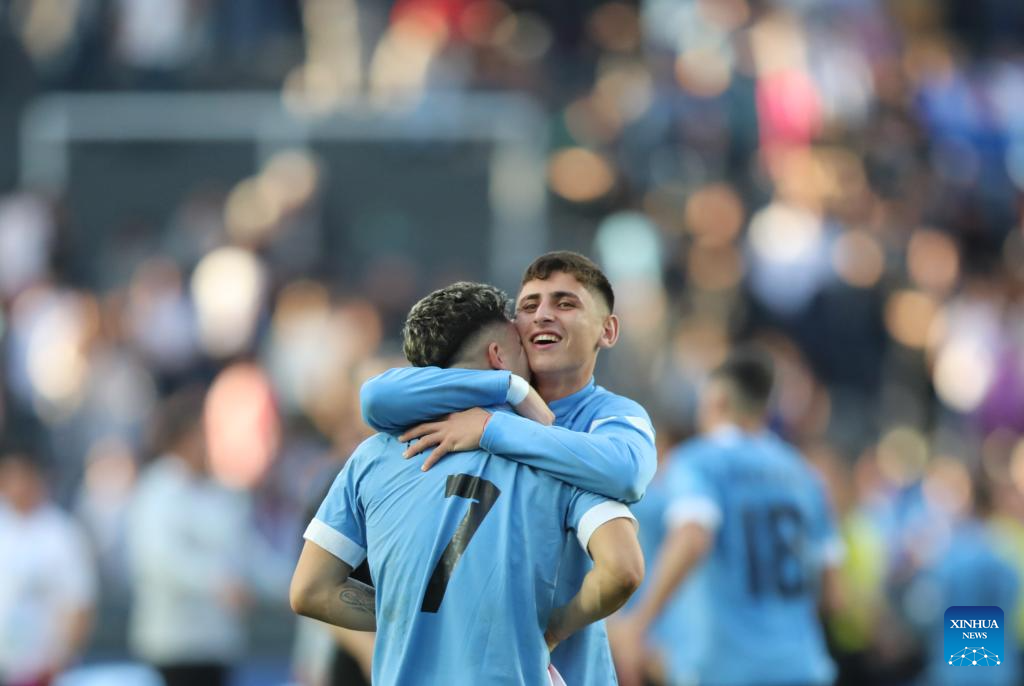 Ignacio Sosa (R) of Uruguay celebrates after the FIFA U20 World Cup semifinal match between Uruguay and Israel in La Plata, Argentina, June 8, 2023. (Xinhua/Wang Tiancong)