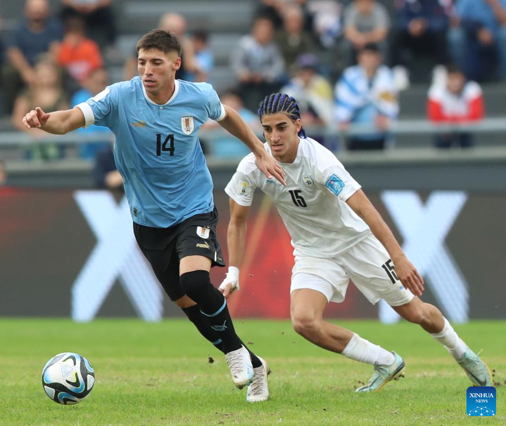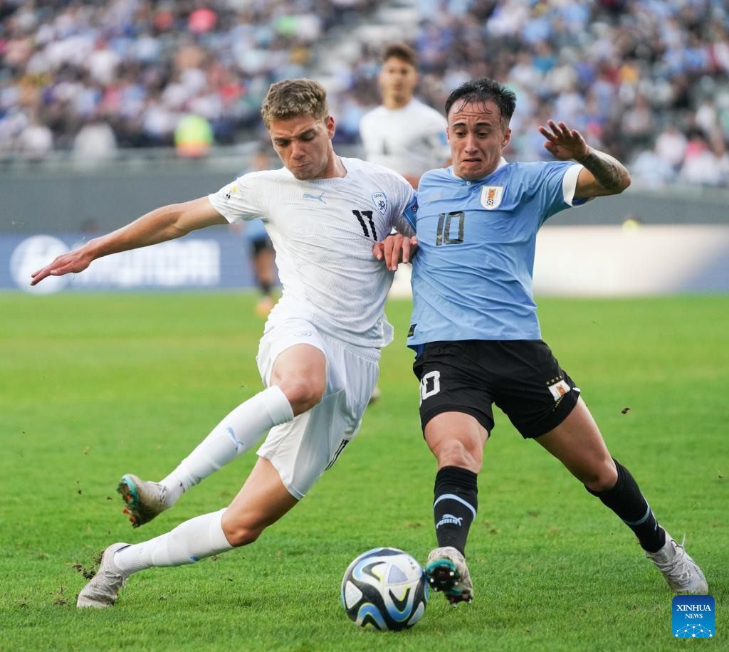 Anderson Duarte (L) of Uruguay vies with Stav Lemkin of Israel during the FIFA U20 World Cup semifinal match between Uruguay and Israel in La Plata, Argentina, June 8, 2023. (Xinhua/Wang Tiancong)