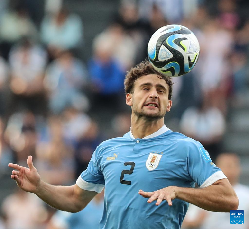 Sebastian Boselli of Uruguay heads the ball during the FIFA U20 World Cup semifinal match between Uruguay and Israel in La Plata, Argentina, June 8, 2023. (Xinhua/Wang Tiancong)