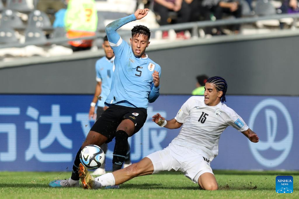 Juan de Los Santos (R) of Uruguay breaks through during the FIFA U20 World Cup semifinal match between Uruguay and Israel in La Plata, Argentina, June 8, 2023. (Xinhua/Wang Tiancong)