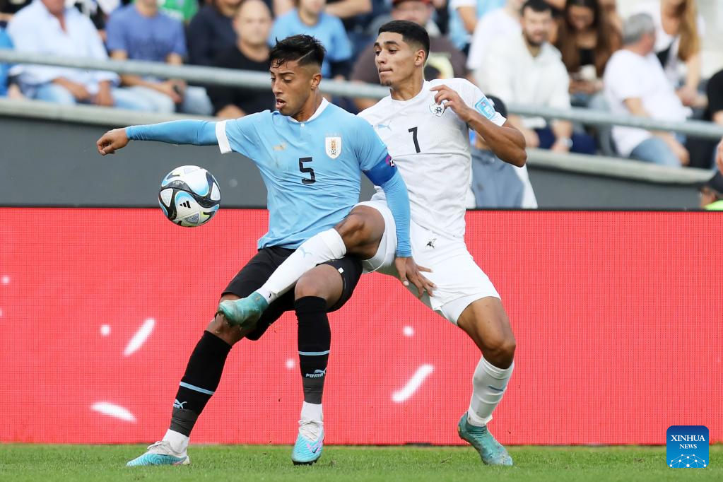 Franco Gonzalez (R) of Uruguay vies with Omer Senior of Israel during the FIFA U20 World Cup semifinal match between Uruguay and Israel in La Plata, Argentina, June 8, 2023. (Xinhua/Wang Tiancong)
