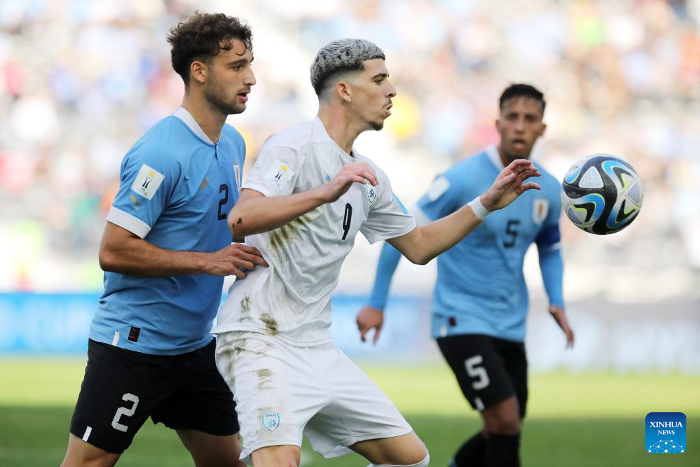 Sebastian Boselli (L) of Uruguay vies with Dor Turgeman (C) of Israel during the FIFA U20 World Cup semifinal match between Uruguay and Israel in La Plata, Argentina, June 8, 2023. (Photo by Martin Zabala/Xinhua)