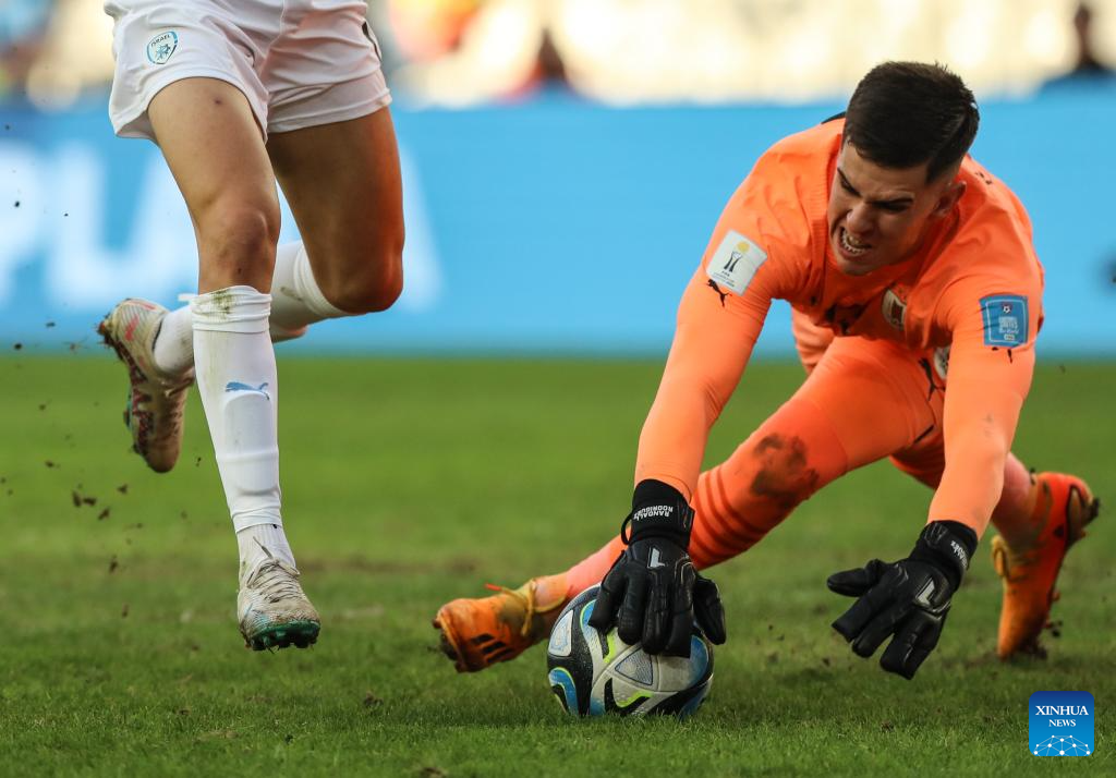 Randall Rodriguez (R), goalkeeper of Uruguay, makes a save during the FIFA U20 World Cup semifinal match between Uruguay and Israel in La Plata, Argentina, June 8, 2023. (Xinhua/Wang Tiancong)