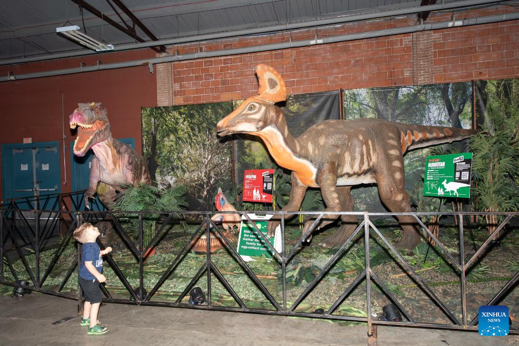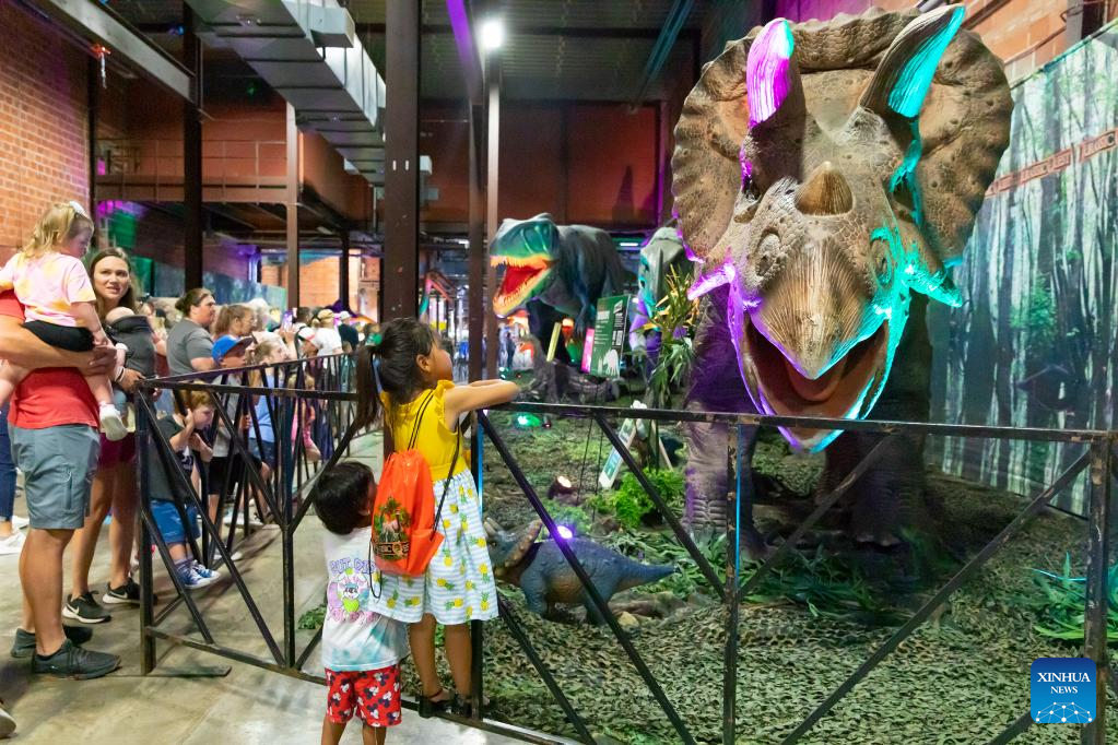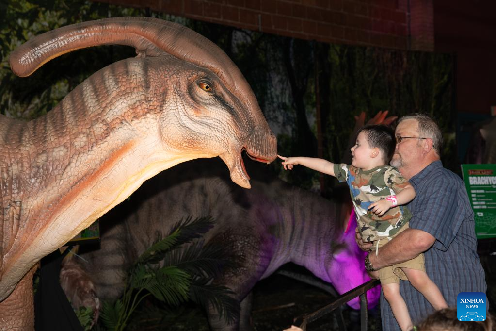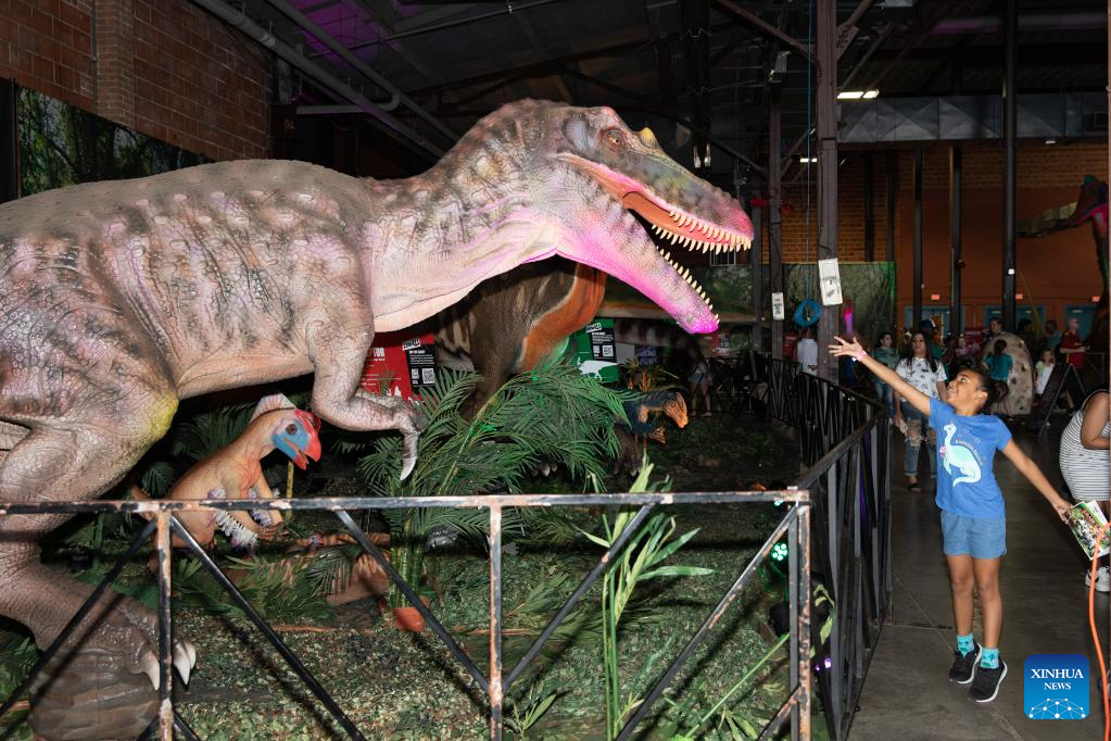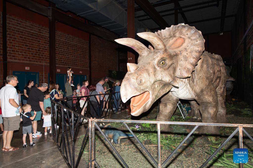 People visit the Jurassic Quest exhibition in Dallas, Texas, the United States, on June 9, 2023. (Photo by Dan Tian/Xinhua)