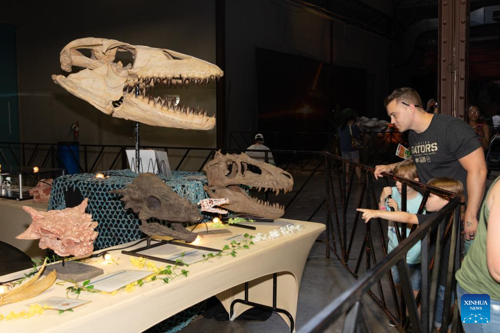People look at dinosaur fossils at the Jurassic Quest exhibition in Dallas, Texas, the United States, on June 9, 2023. (Photo by Dan Tian/Xinhua)