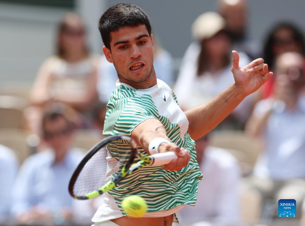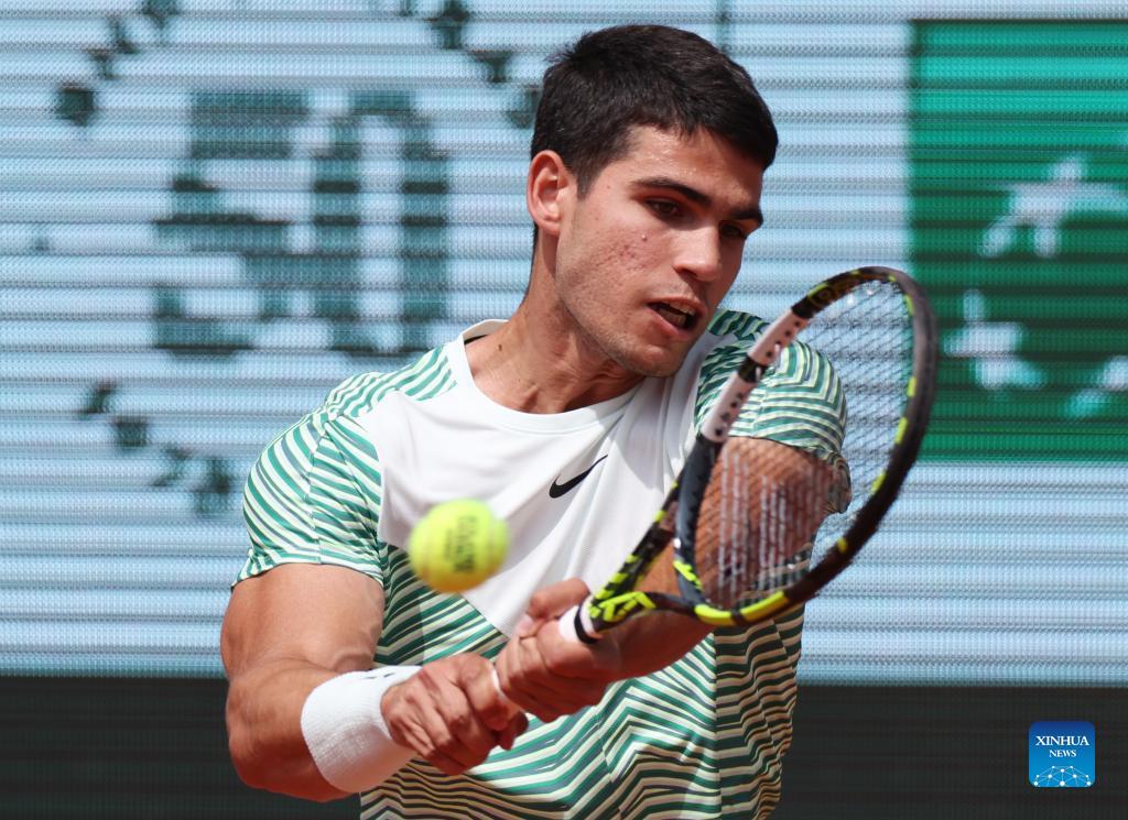 Carlos Alcaraz of Spain hits a return during the men's singles semifinals between Novak Djokovic of Serbia and Carlos Alcaraz of Spain at the French Open tennis tournament at Roland Garros in Paris, France, June 9, 2023. (Xinhua/Gao Jing)