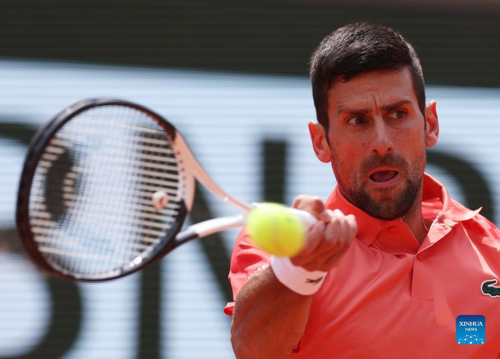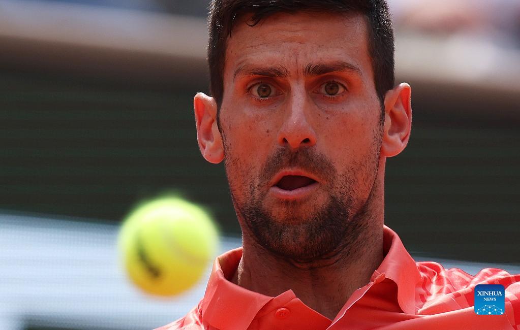 Novak Djokovic of Serbia hits a return during the men's singles semifinals between Novak Djokovic of Serbia and Carlos Alcaraz of Spain at the French Open tennis tournament at Roland Garros in Paris, France, June 9, 2023. (Xinhua/Gao Jing)