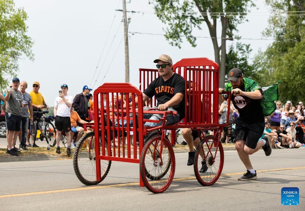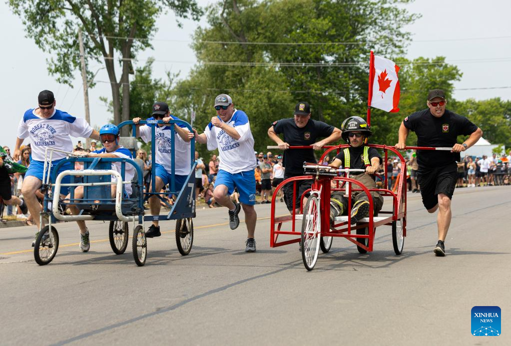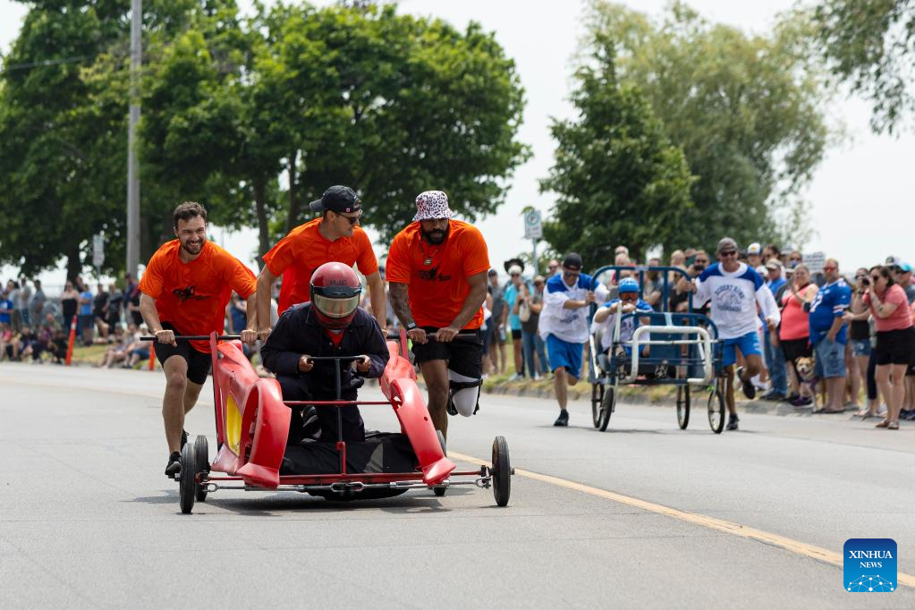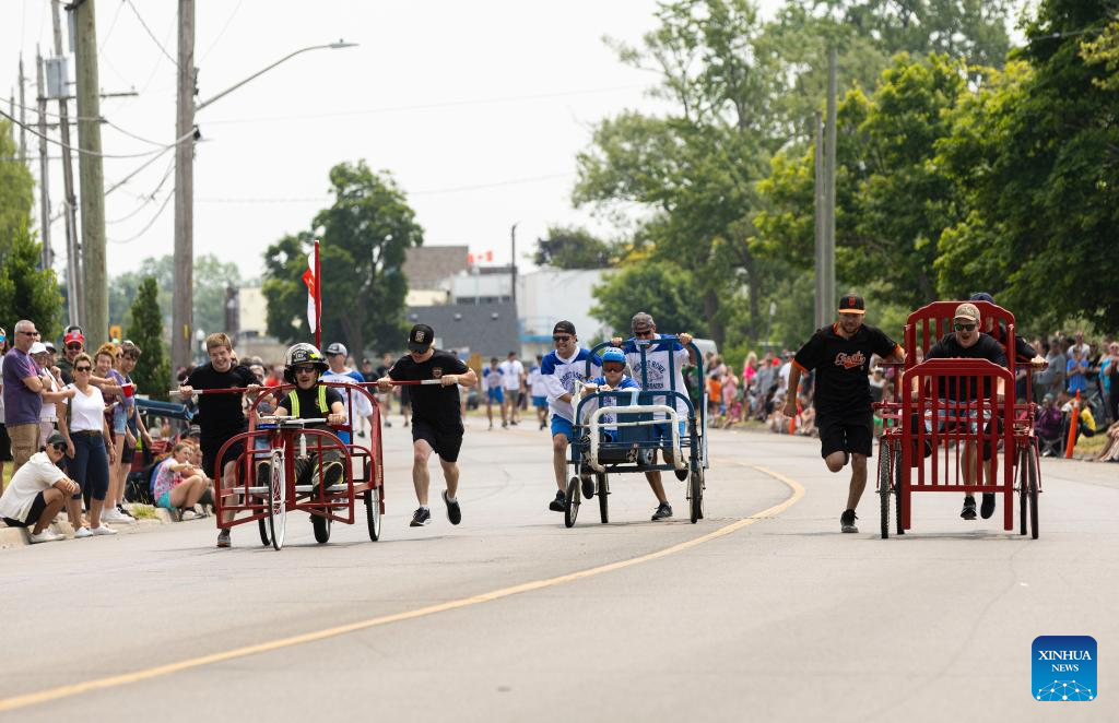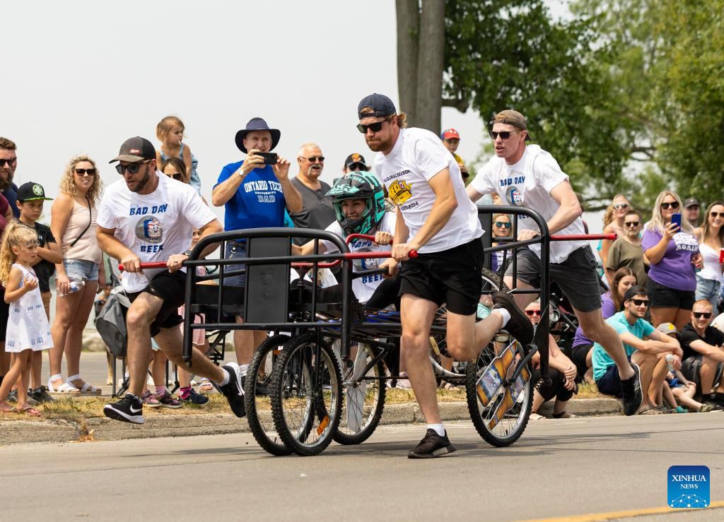 Participants compete during the Bed Race of the 2023 Dunnville Mudcat Festival in Dunnville, Ontario, Canada, on June 10, 2023. (Photo by Zou Zheng/Xinhua)