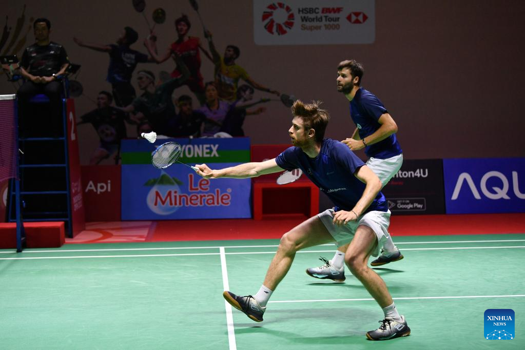 France's Lucas Corvee (R)/Ronan Labar compete during the men's doubles first round match against China's He Jiting/Zhou Haodong at Indonesia Open 2023 in Jakarta, Indonesia, June 13, 2023. (Xinhua/Xu Qin)