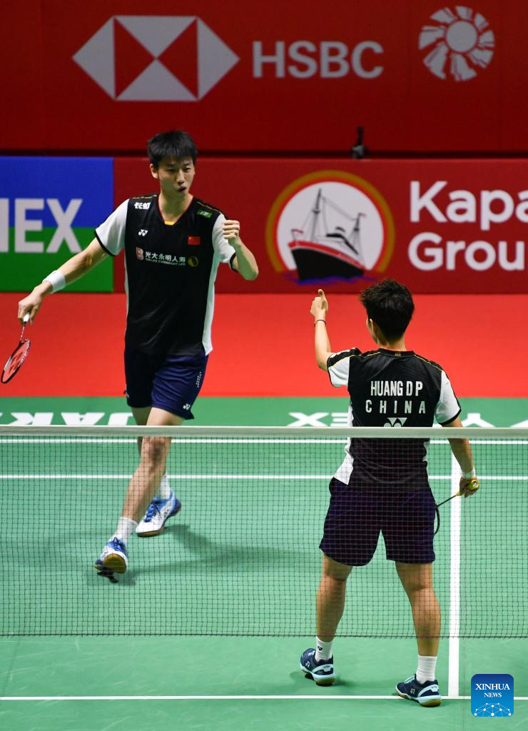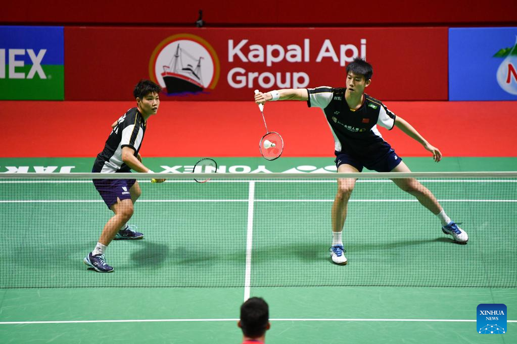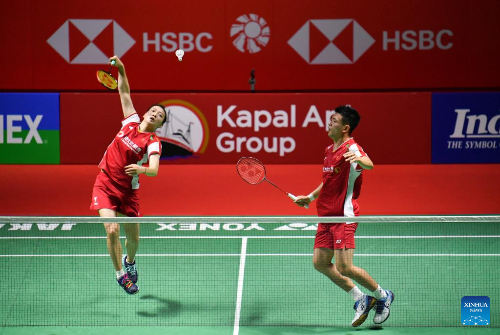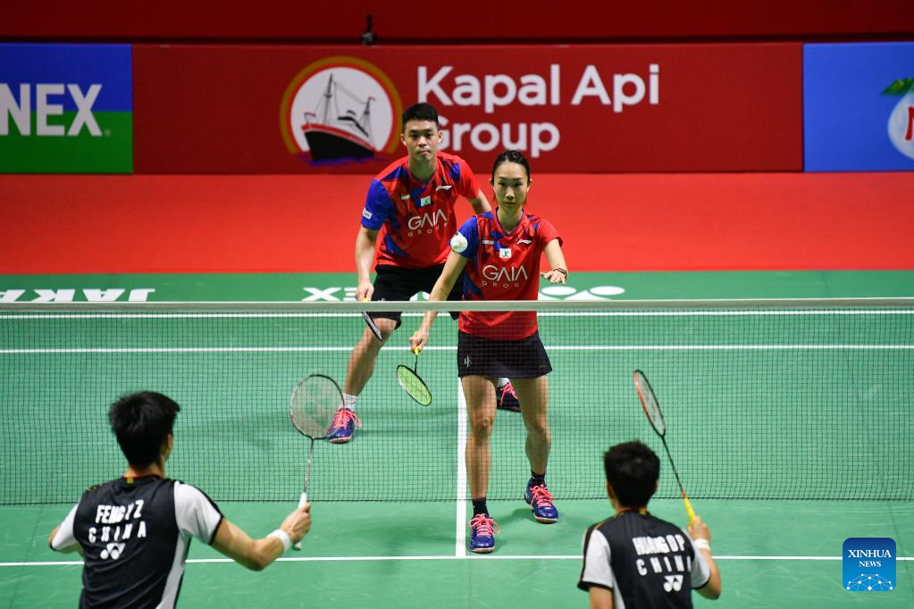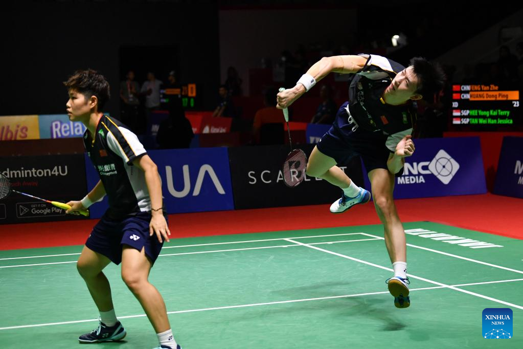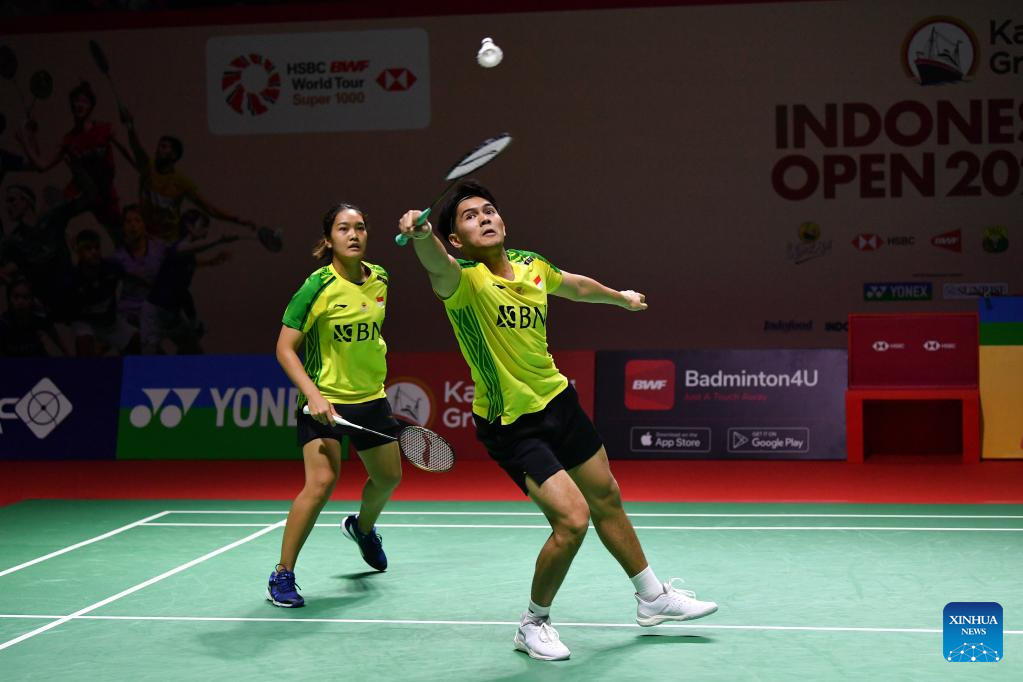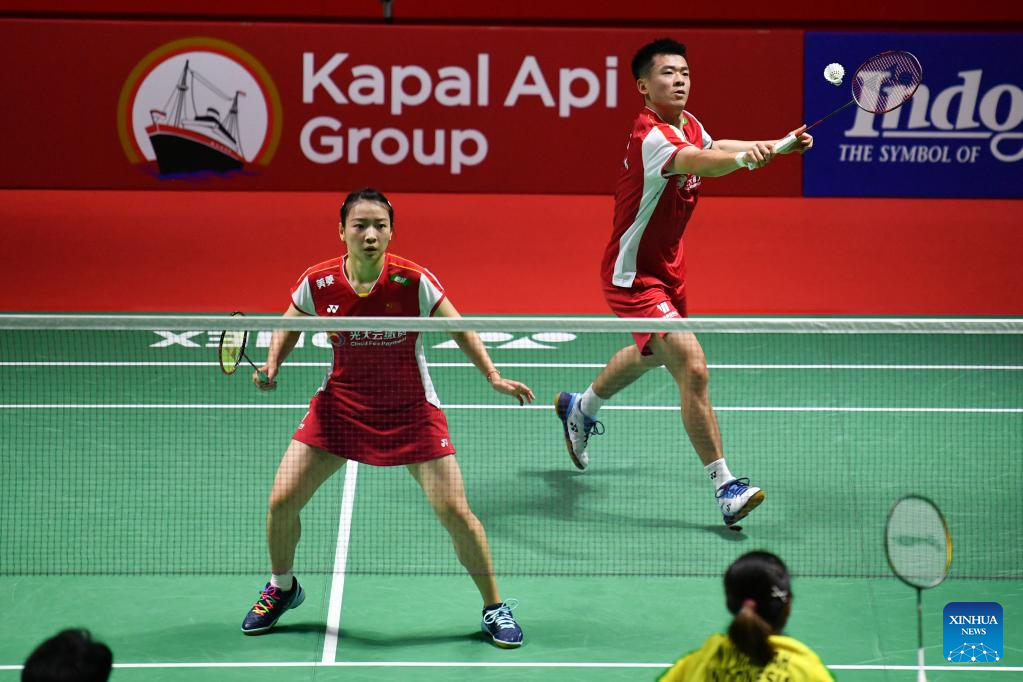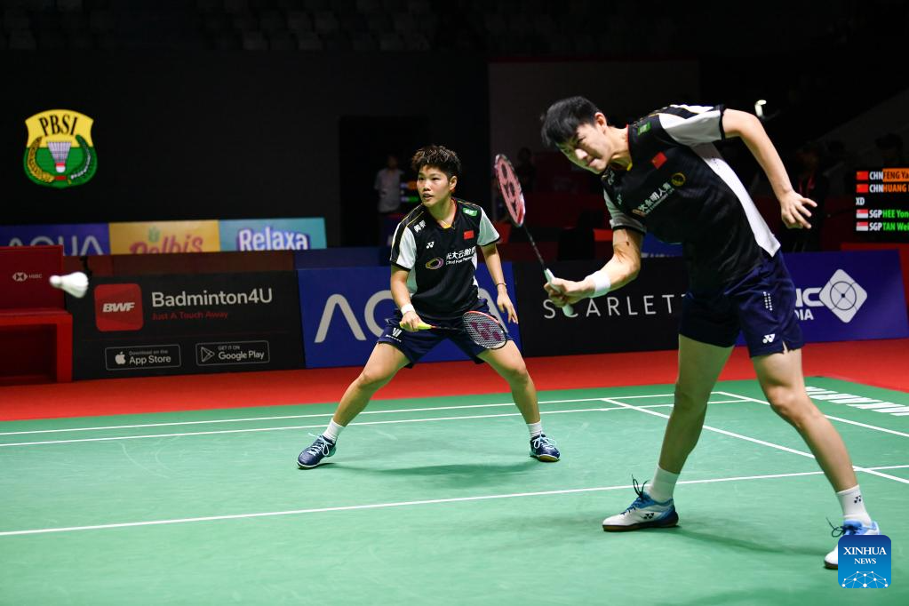 China's Feng Yanzhe(L)/Huang Dongping compete during the mixed doubles first round match against Singapore's Hee Yong Kai Terry/Tan Wei Han Jessica at Indonesia Open 2023 in Jakarta, Indonesia, June 13, 2023. (Xinhua/Xu Qin)