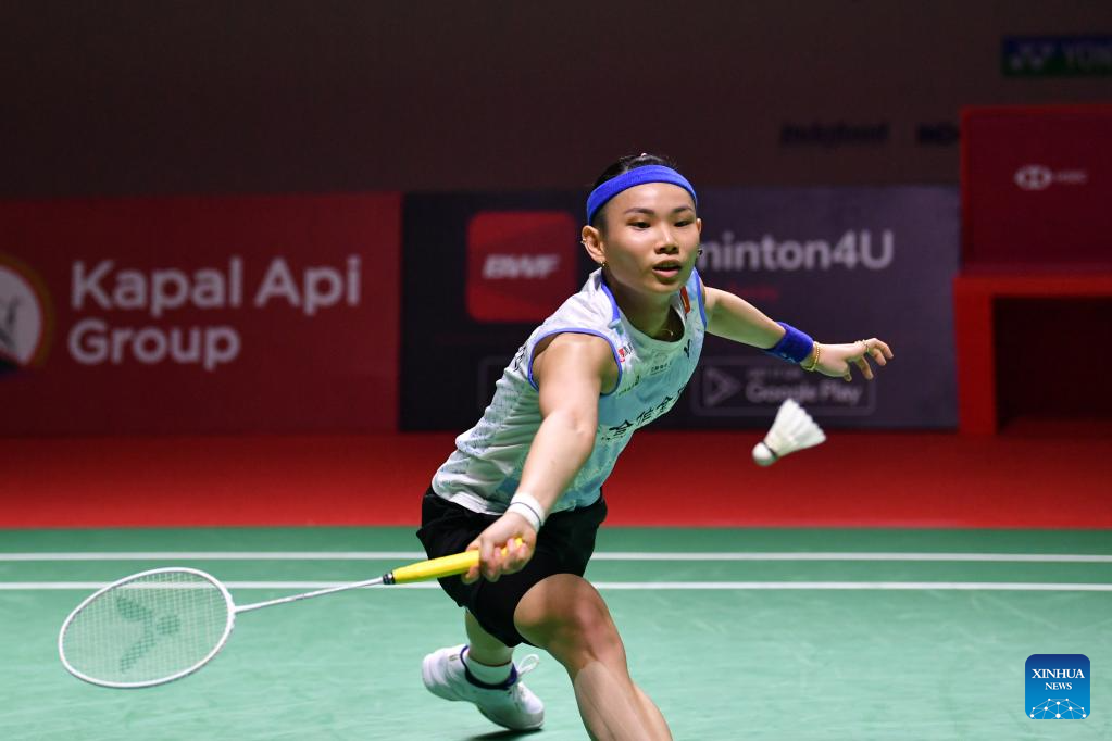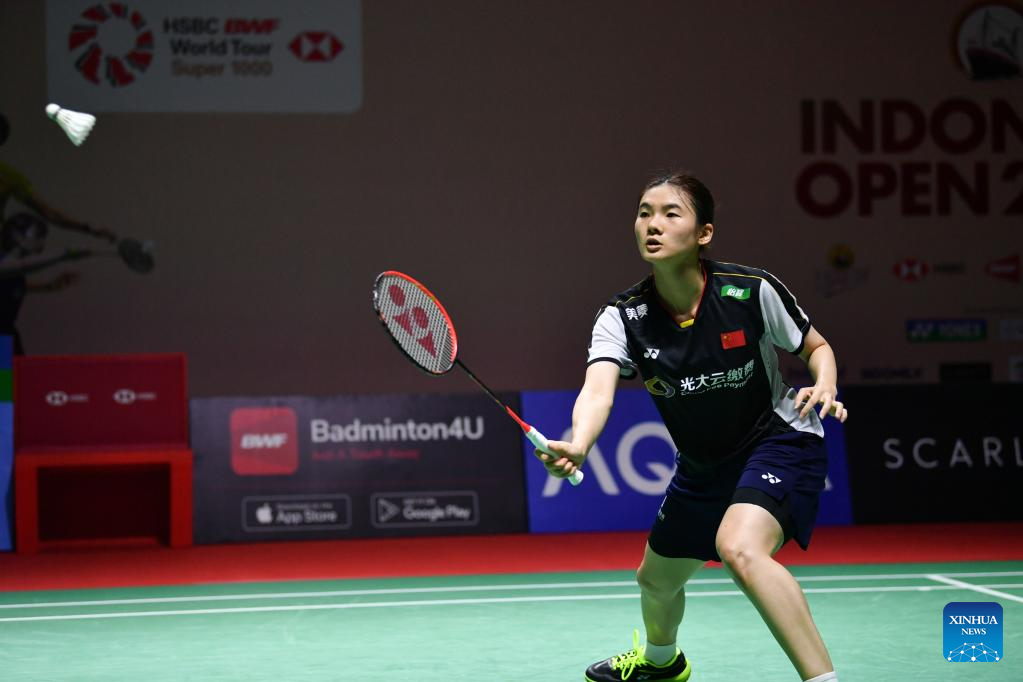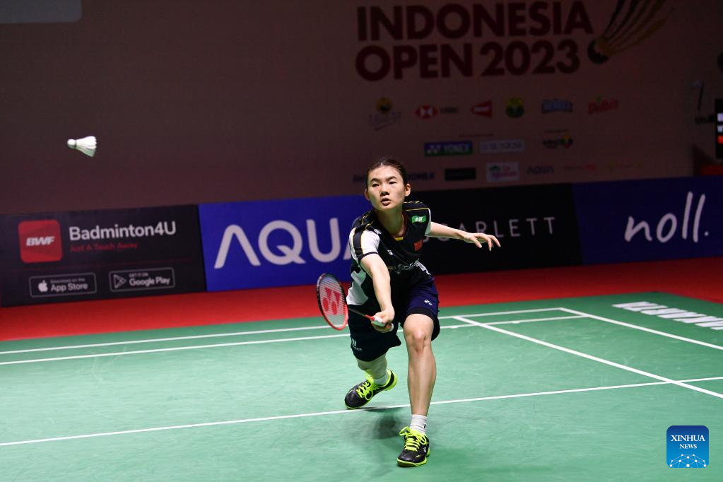 China's Han Yue hits a return during the women's singles first round match against Chinese Taipei's Tai Tzu Ying at Indonesia Open 2023 in Jakarta, Indonesia, June 13, 2023. (Xinhua/Xu Qin)