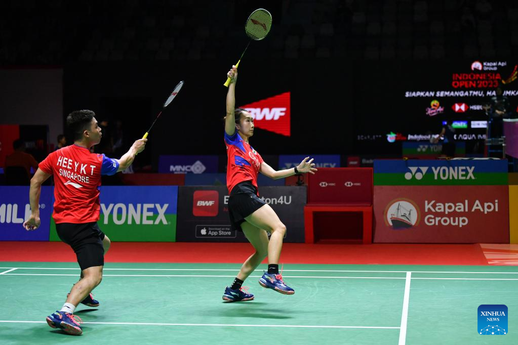 China's Feng Yanzhe (R)/Huang Dongping compete during the mixed doubles first round match against Singapore's Hee Yong Kai Terry/Tan Wei Han Jessica at Indonesia Open 2023 in Jakarta, Indonesia, June 13, 2023. (Xinhua/Xu Qin)