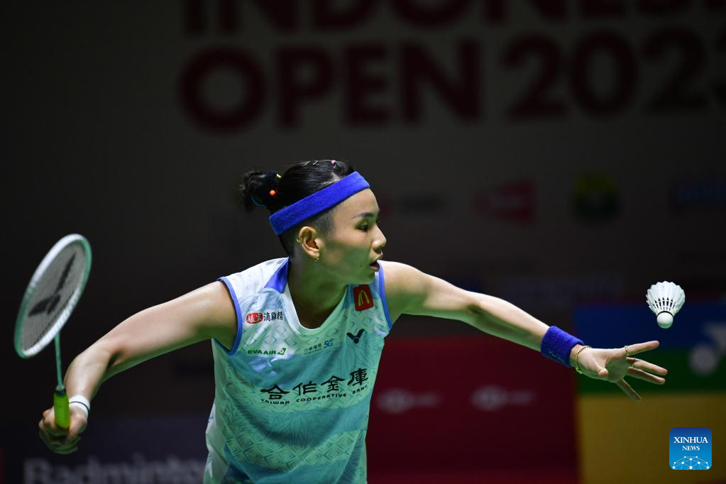Chinese Taipei's Tai Tzu Ying hits a return during the women's singles first round match against China's Han Yue at Indonesia Open 2023 in Jakarta, Indonesia, June 13, 2023. (Xinhua/Xu Qin)