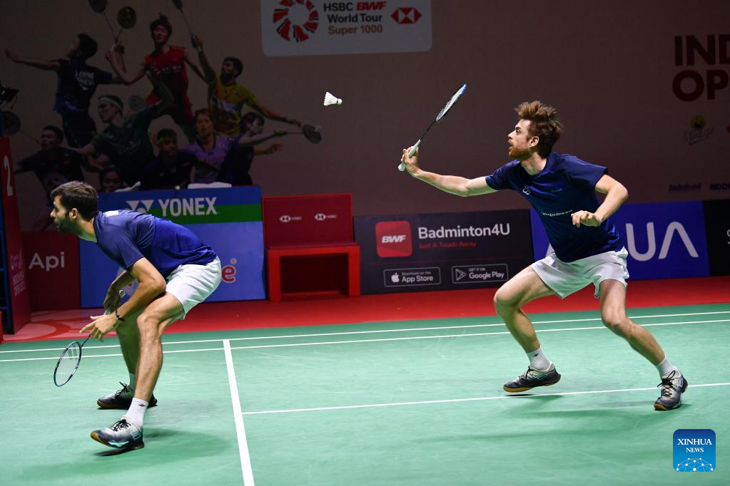 France's Lucas Corvee (L)/Ronan Labar compete during the men's doubles first round match against China's He Jiting/Zhou Haodong at Indonesia Open 2023 in Jakarta, Indonesia, June 13, 2023. (Xinhua/Xu Qin)