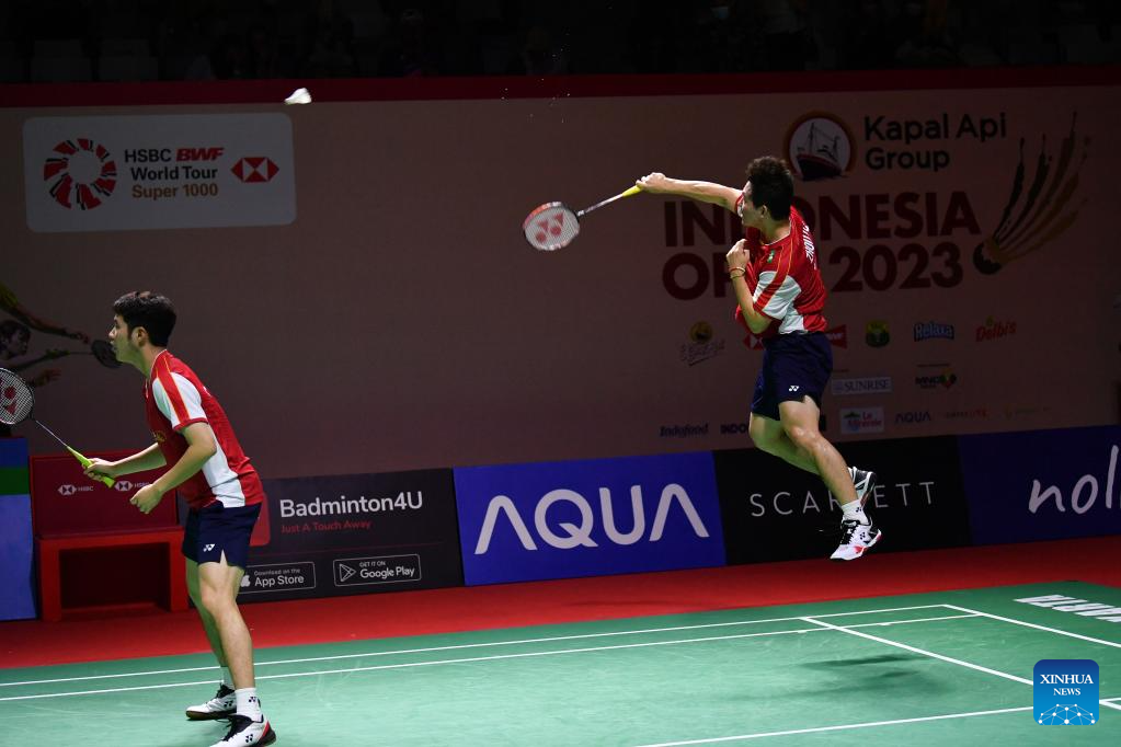 China's He Jiting/Zhou Haodong (R) compete during the men's doubles first round match against France's Lucas Corvee/Ronan Labar at Indonesia Open 2023 in Jakarta, Indonesia, June 13, 2023. (Xinhua/Xu Qin)