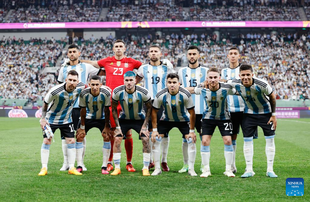 Players of Argentina pose for photos ahead of an international football invitational between Argentina and Australia in Beijing, capital of China, June 15, 2023. (Xinhua/Wang Lili)