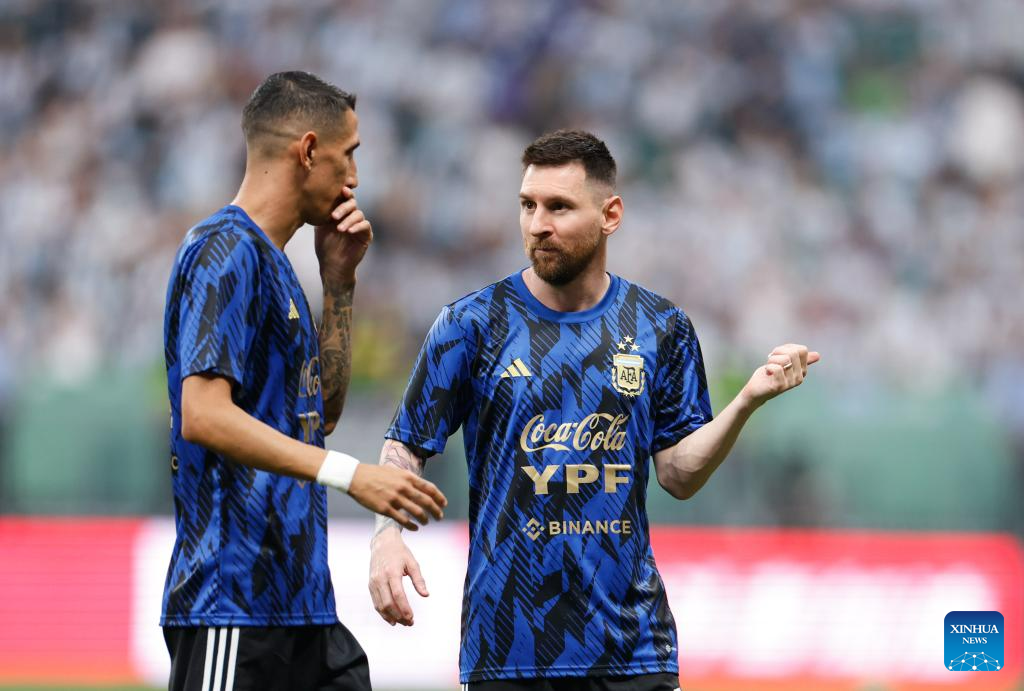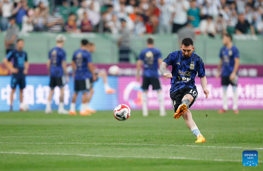 Lionel Messi (C) of Argentina warms up ahead of an international football invitational between Argentina and Australia in Beijing, capital of China, June 15, 2023. (Xinhua/Jia Haocheng)